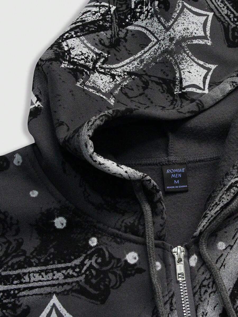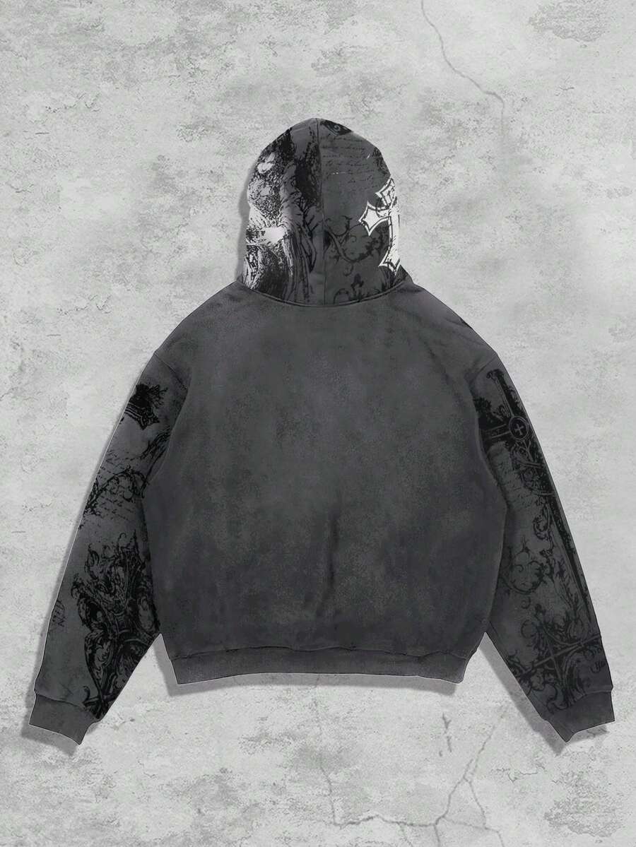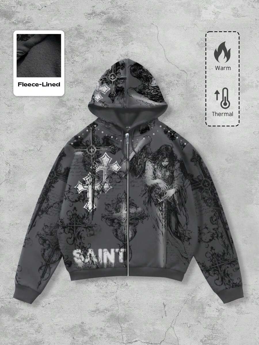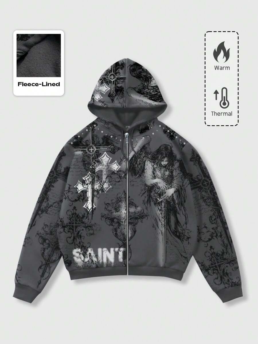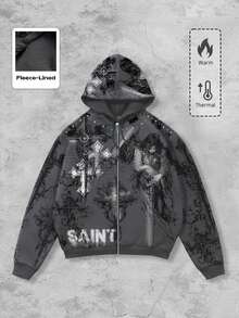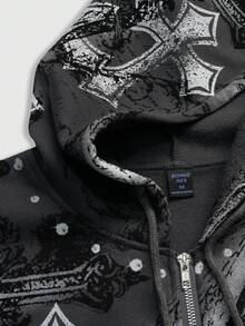 Anime Sudadera con capucha con cremallera y estampado de cruz y letras para hombre