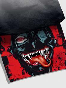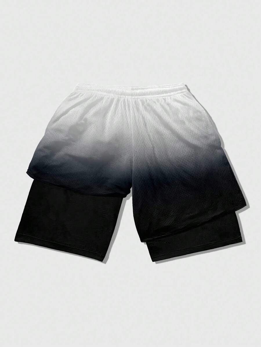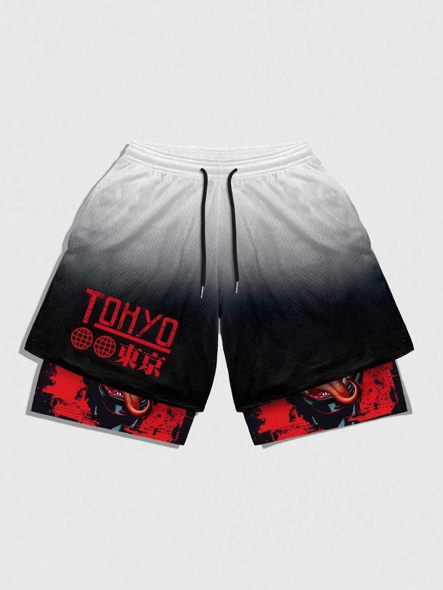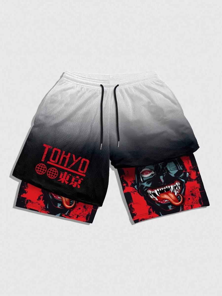 Anime Pantalones cortos con cordón en la cintura, de doble capa, con estampado de letras y dibujos animados para hombres
