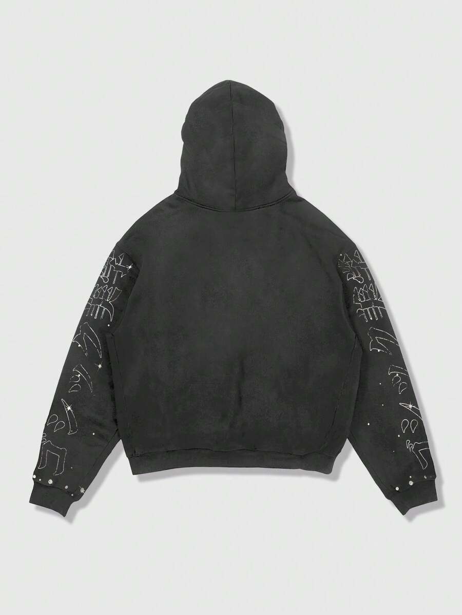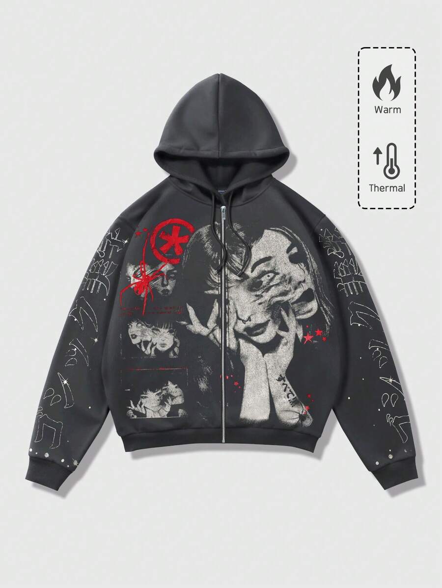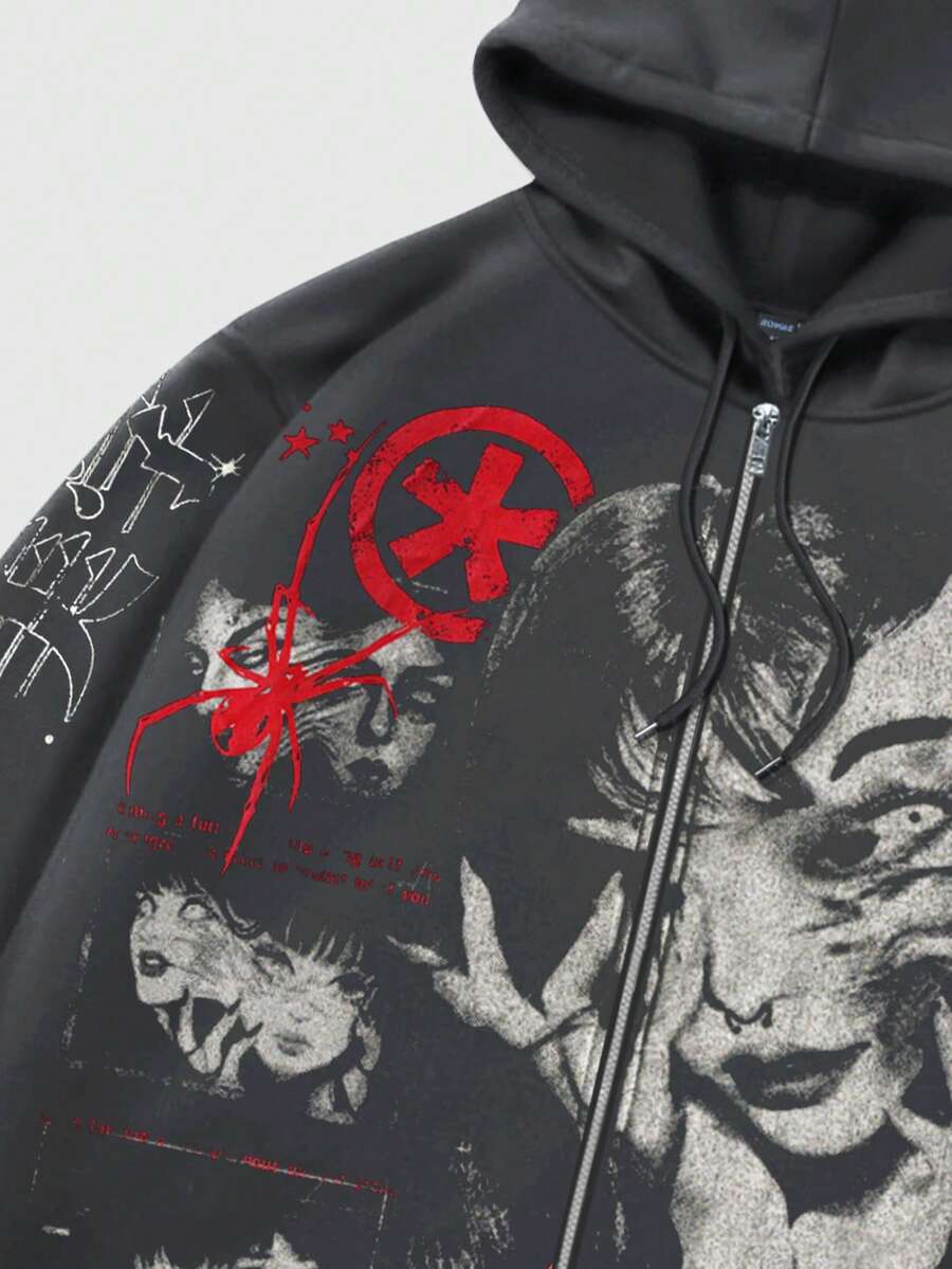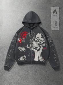 Anime Sudadera con capucha y cremallera de manga larga con estampado de retrato callejero para hombre