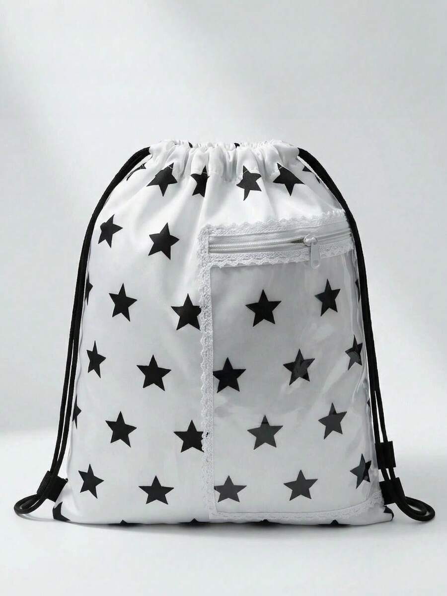 Anime Bolsa con cremallera con estampado de estrella retro, bolsillo con cremallera transparente, mochila de gran capacidad multifuncional con encaje blanco de estilo Y2K, adecuada para la escuela, la playa y el uso diario