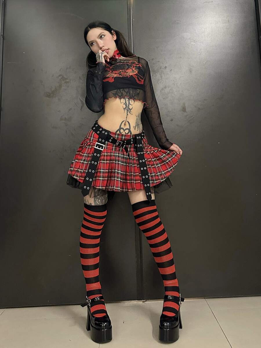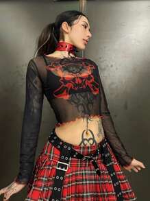 Anime Top estampado de cráneo ribete en forma de lechuga de malla