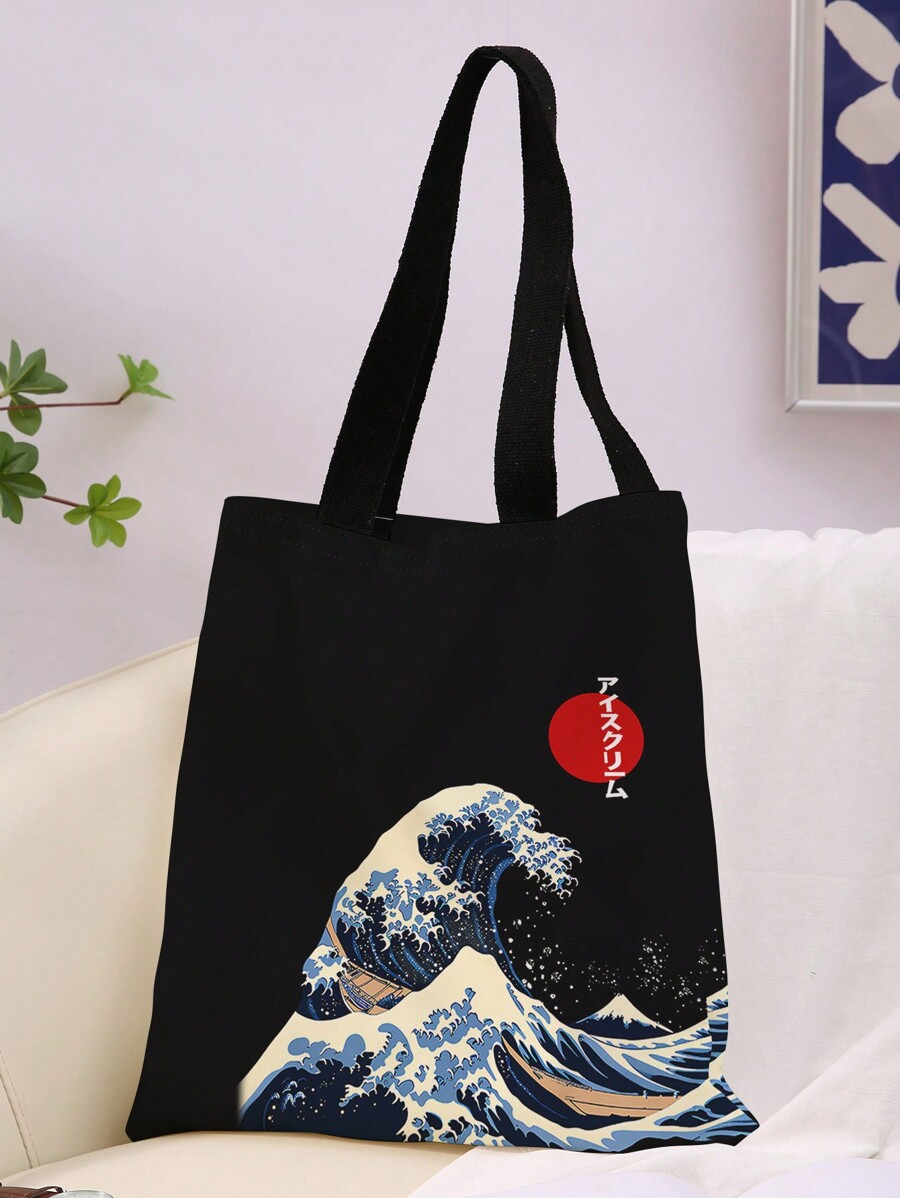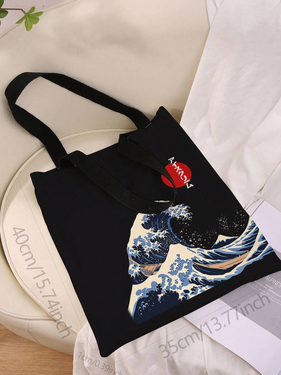 Anime Bolso Bandolera De Lona Con Patrón De Olas Y Sol Rojo Impreso A Doble Cara