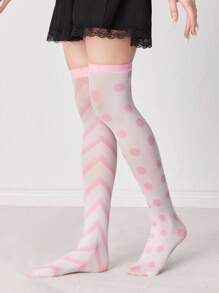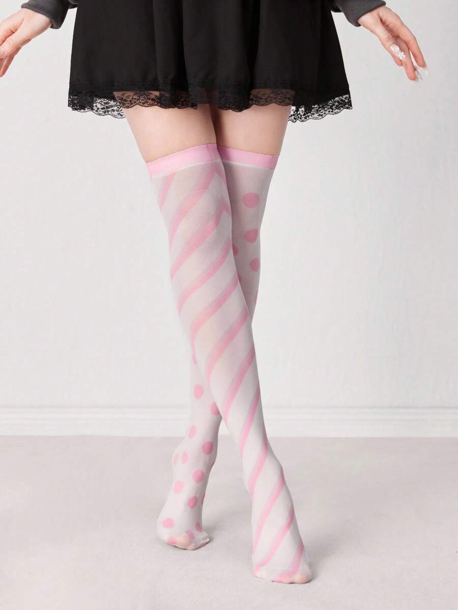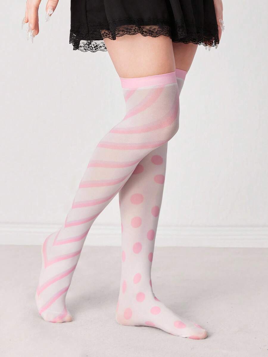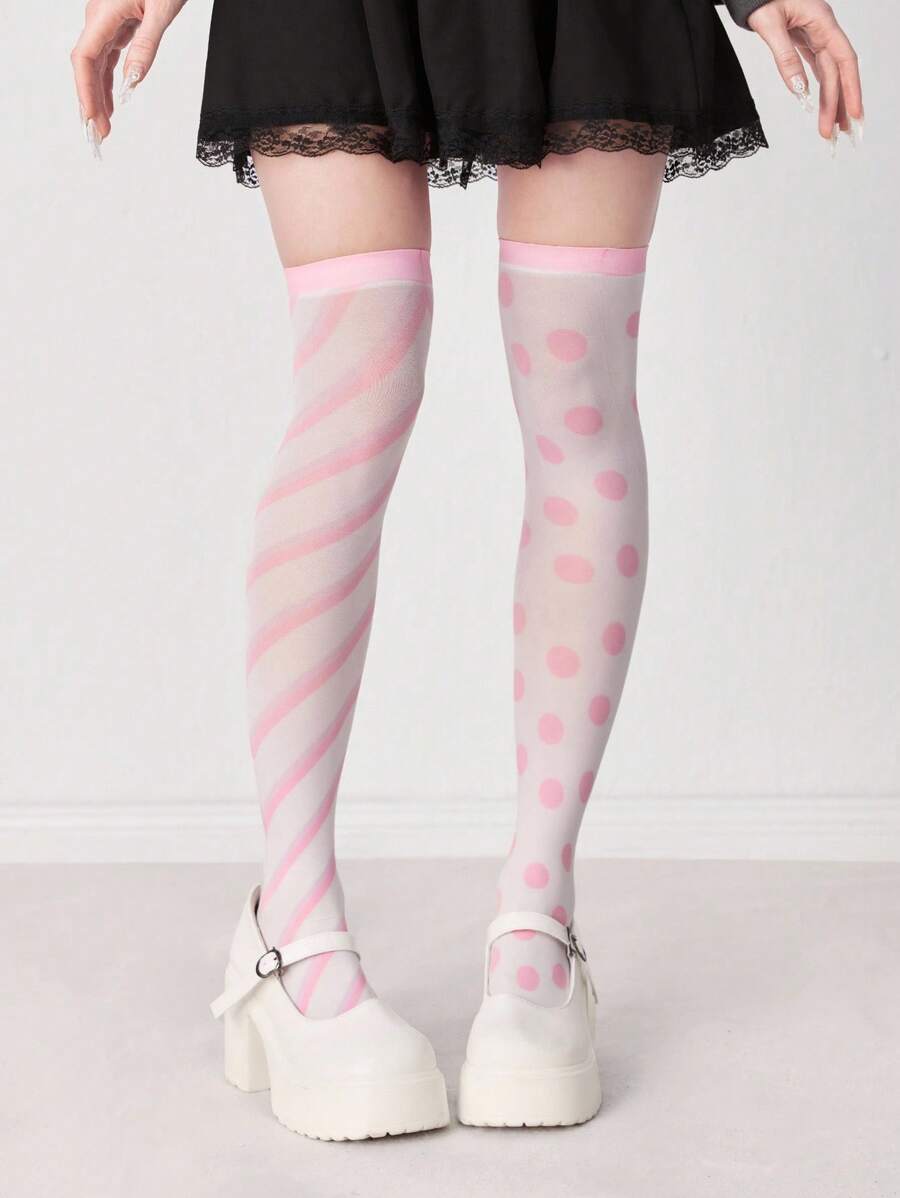Anime Calcetines por encima de la rodilla asimétricos blancos, a rayas y con lunares, de moda, dulces, lindos y versátiles para todas las estaciones