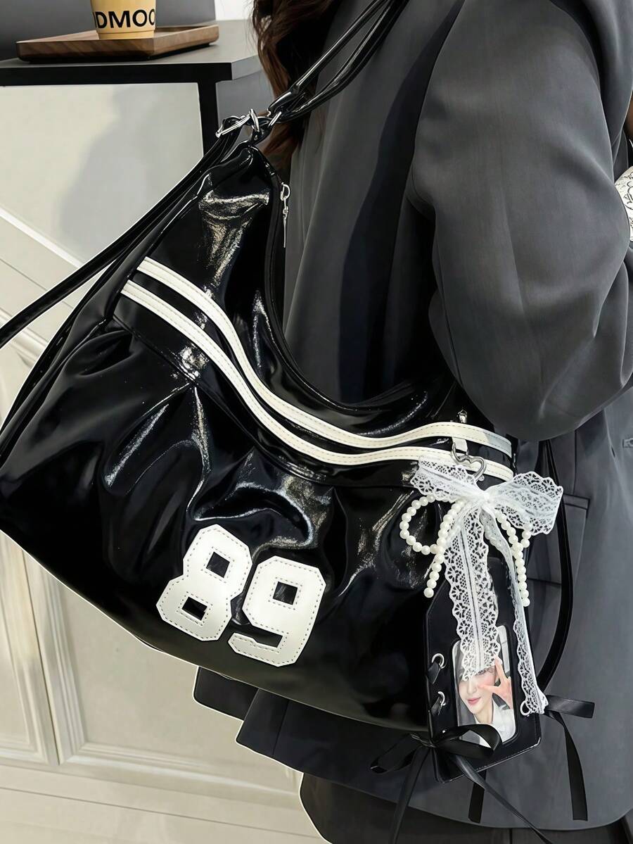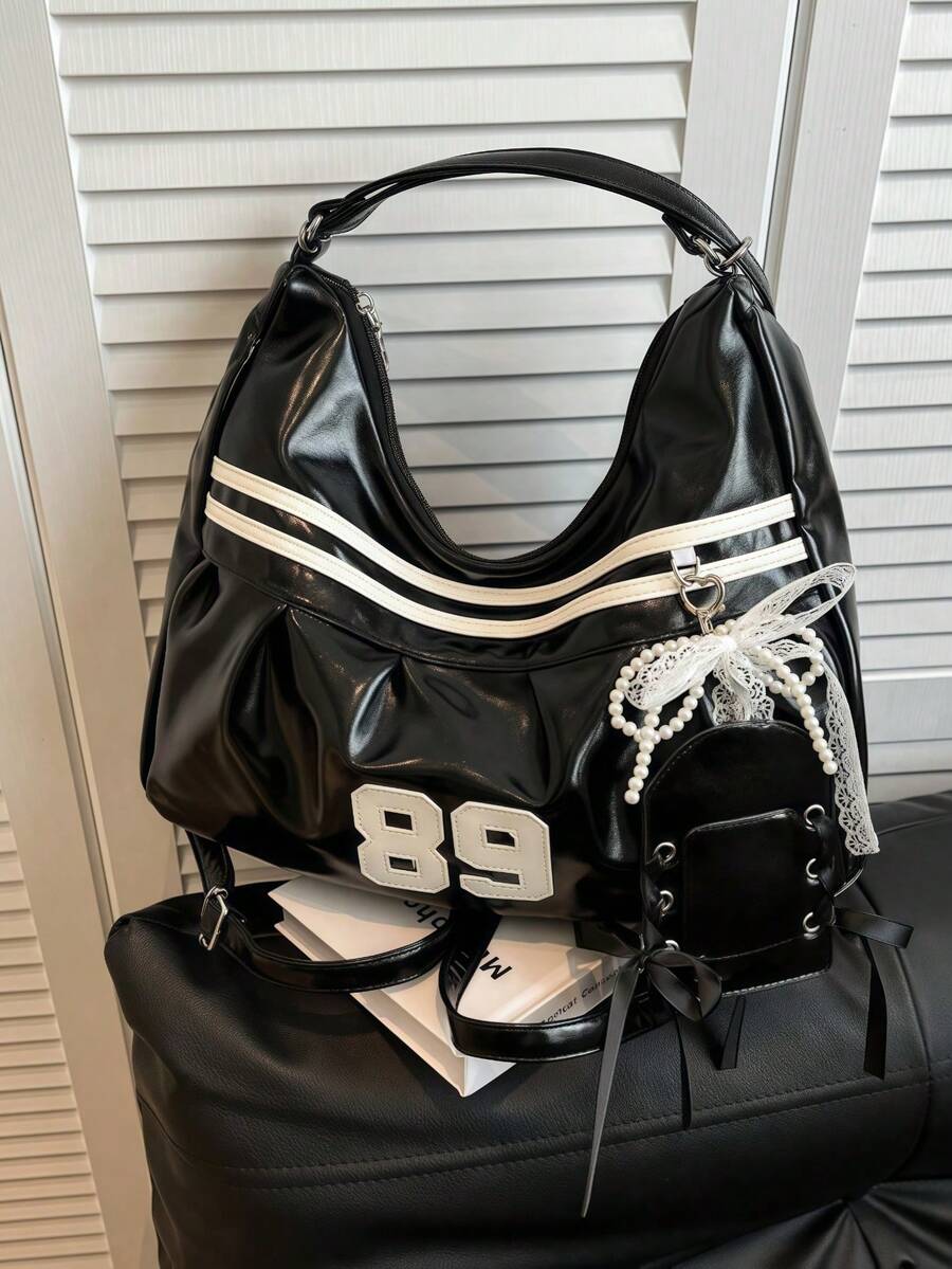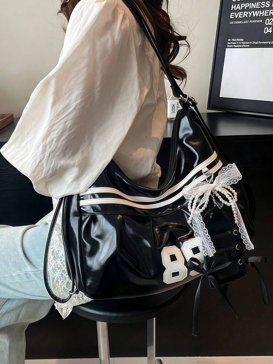 Anime Bolso de hombro con corazón metálico estilo Punk Y2K para mujer, bolso de mano casual deportivo con números para mujer entre dulce y picante, mochila ajustable con lazo de encaje y rayas sólidas, adecuado para el commute diario, viajes, etc.