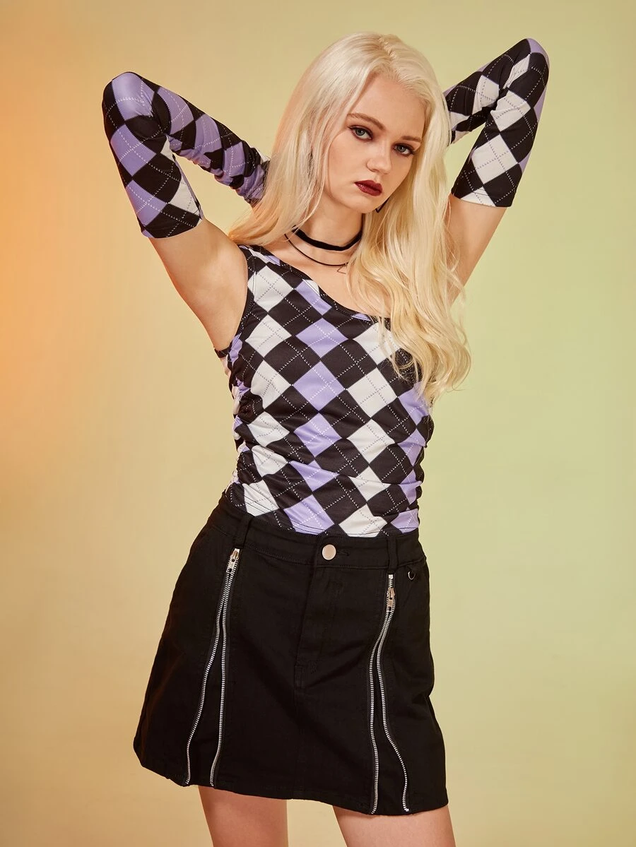 con estampado de rombo de un hombro Top con 1 par Mangote
