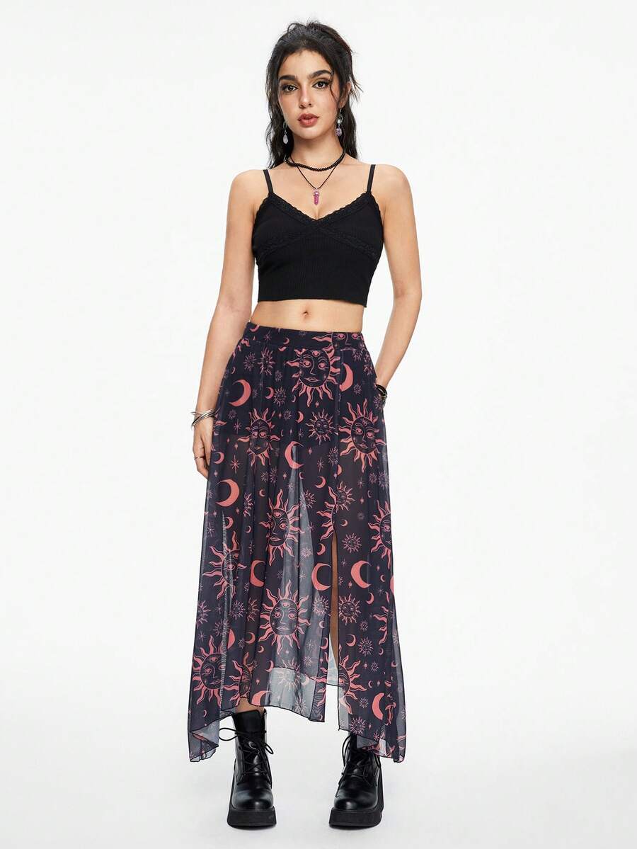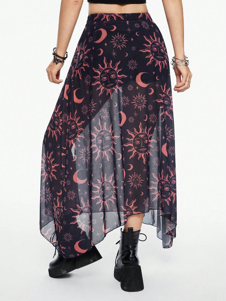 Falda asimétrica de dobladillo oscuro con estampado de sol, luna y estrellas, para el verano, vacaciones, fiesta, Año Nuevo, primavera, festival