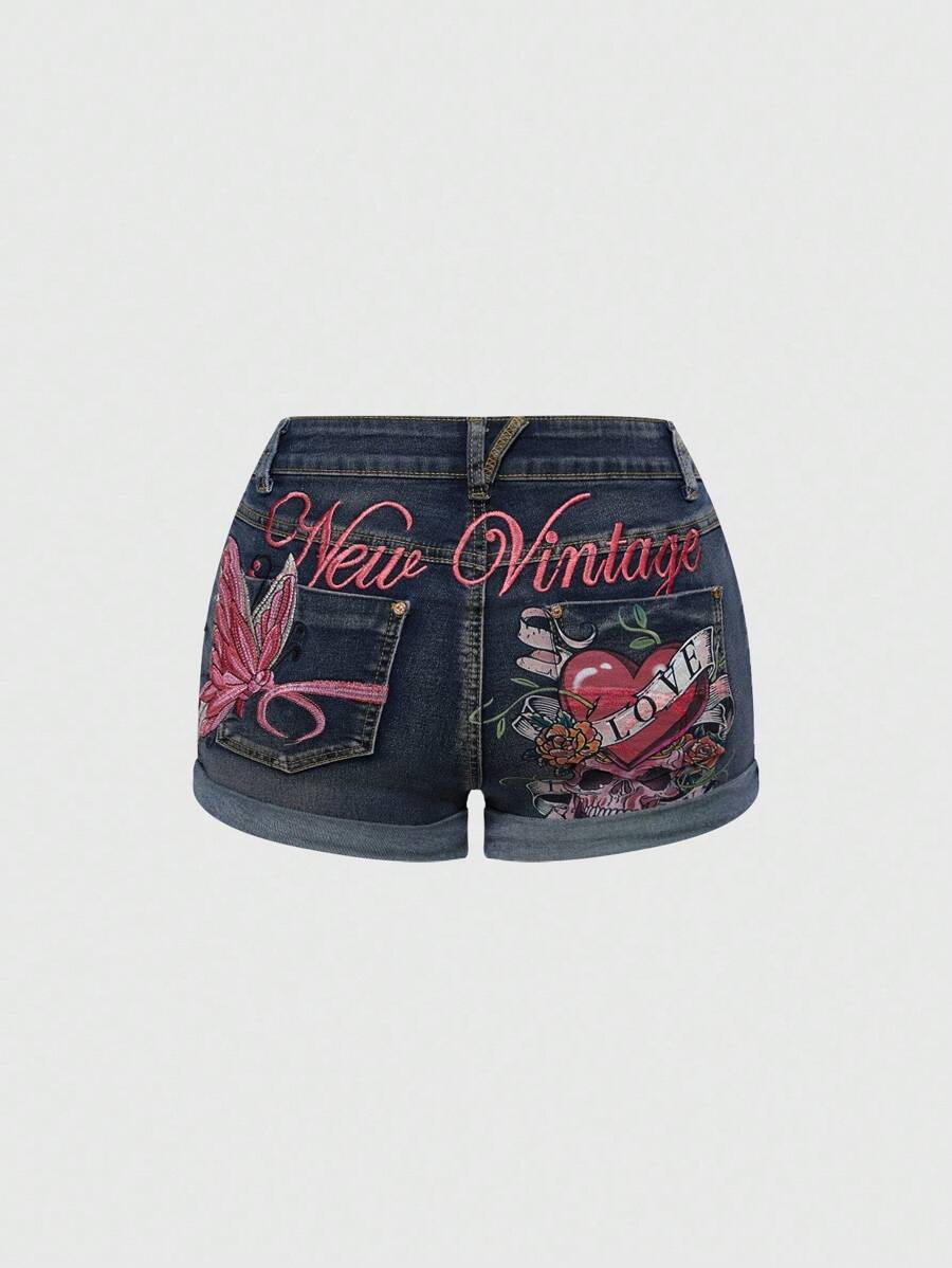 Fairycore Pantalones cortos de mezclilla con talle bajo, bordados con mariposas y calaveras, con efecto desgastado, estilo vintage Y2K sexy, para mujeres de talla grande, de vuelta al colegio
