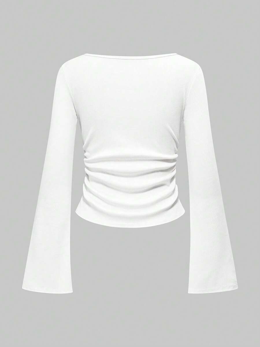 Goth Camiseta básica de mujer de manga larga, cuello de barco, manga acampanada, unicolor, ajuste ceñido, color blanco