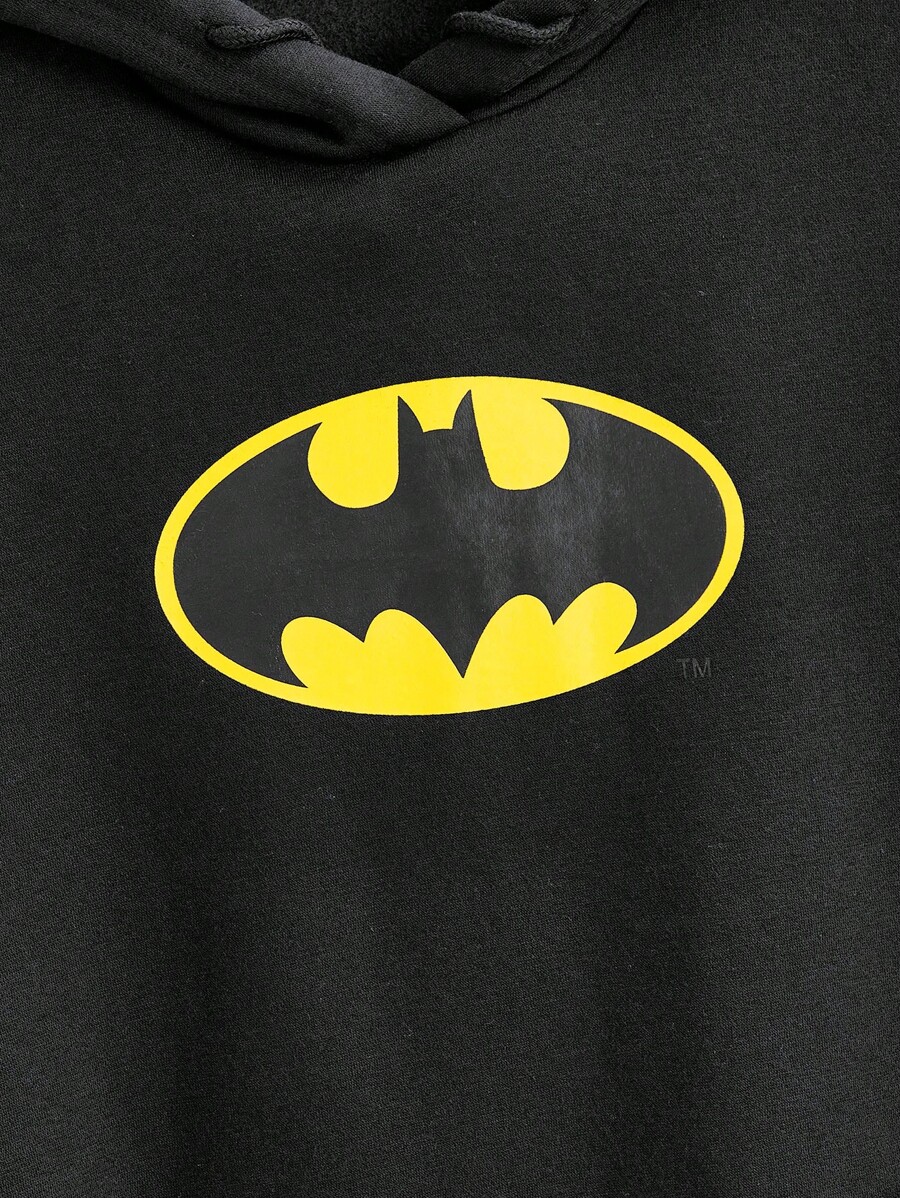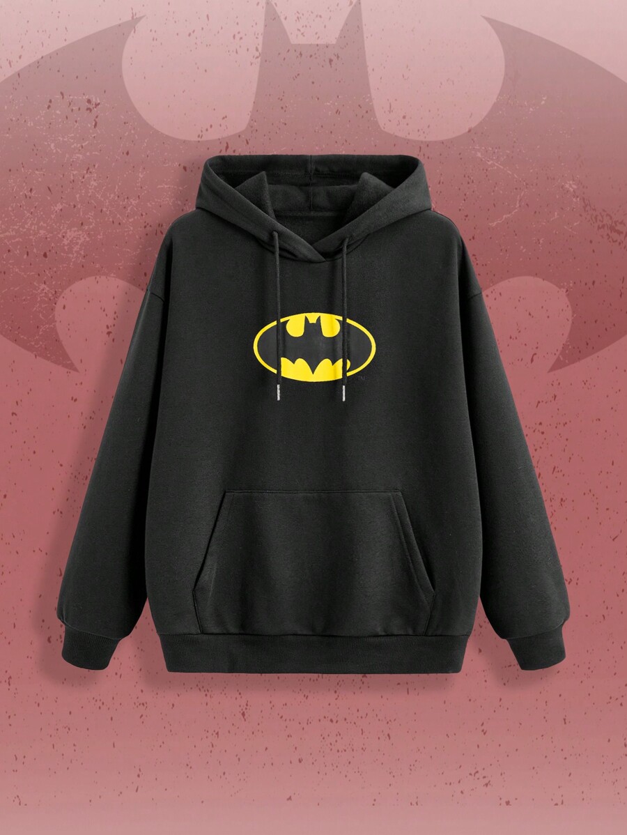 Batman X ROMWE Sudadera con capucha con cordón y bolsillo canguro con estampado de logo de murciélago para mujer, para primavera y otoño, Top de manga larga