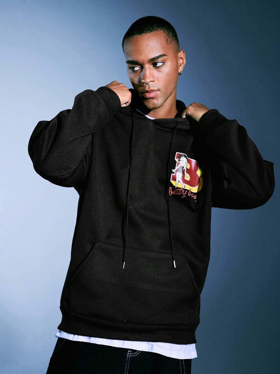 Betty Boop | ROMWE Sudadera con capucha de manga larga con letras y gráfico de dibujos animados para hombres