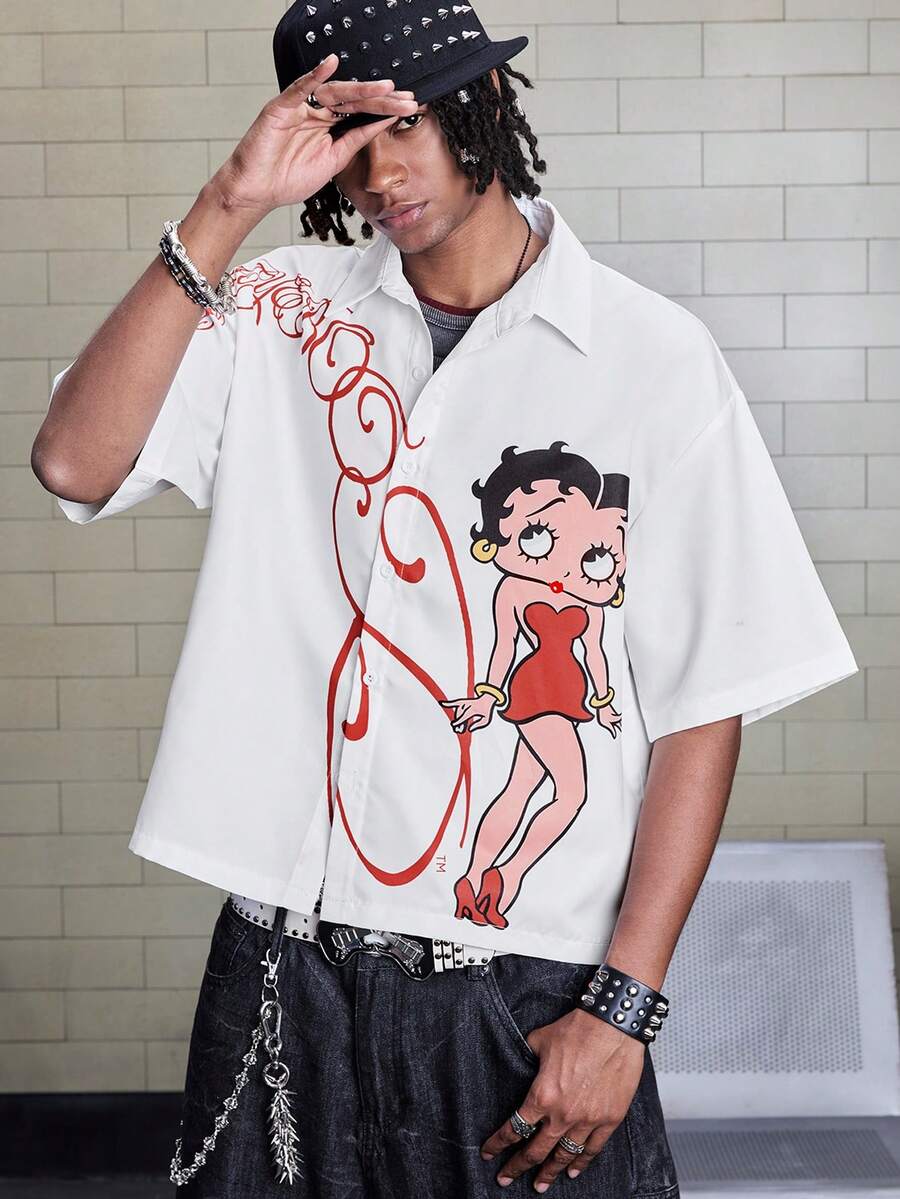 Betty Boop | ROMWE Camisa de manga corta de un solo pecho con estampado de personaje de dibujos animados para hombre