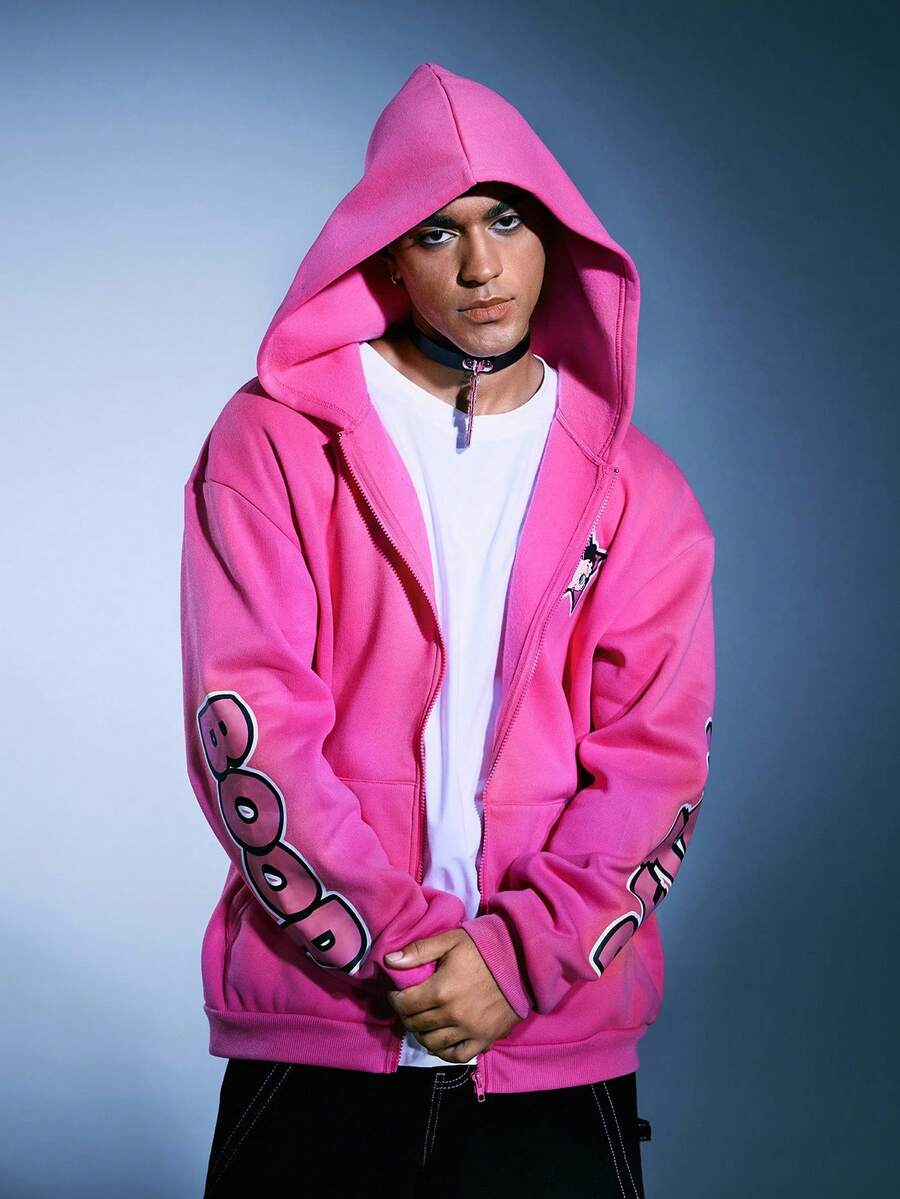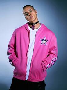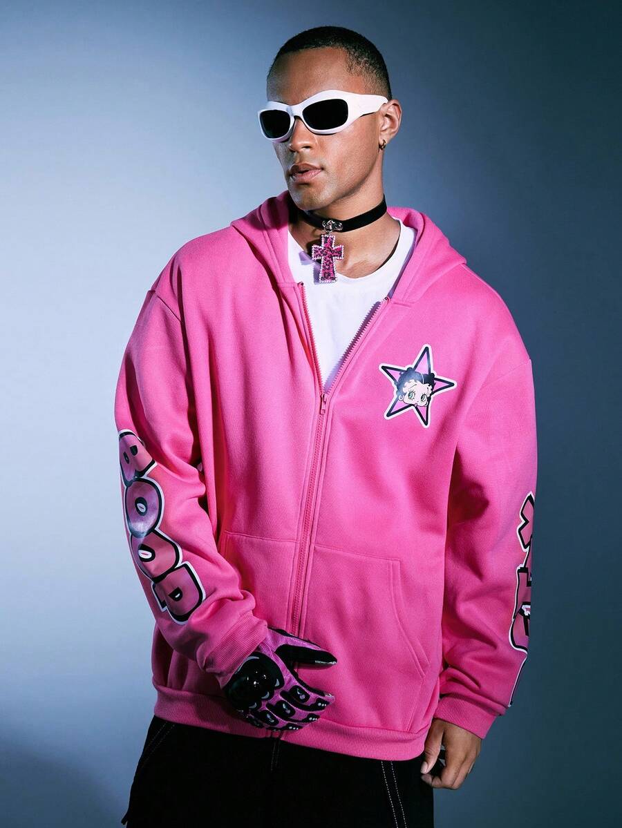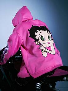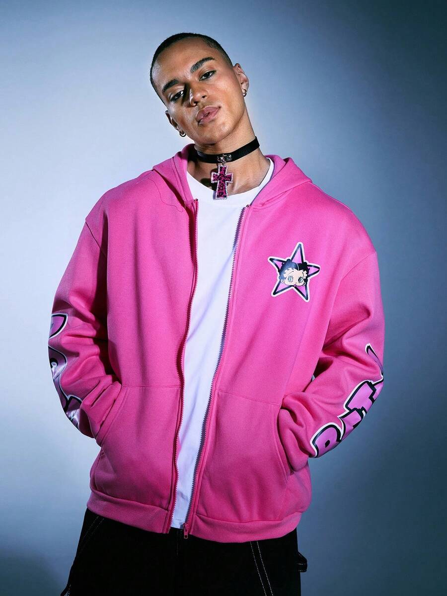 Betty Boop | ROMWE Sudadera con capucha con cremallera en fucsia para hombres con gráfico de dibujos animados, cómoda