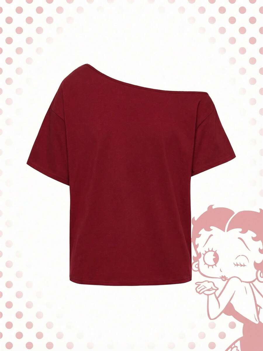 Betty Boop | ROMWE Camiseta de mujer con figura de corazón sexy, dibujo animado y eslogan con hombro oblicuo rosa