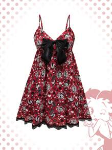 Betty Boop | ROMWE Vestido de tirantes con estampado de corazón y dibujos animados, con lazo frontal de contraste y dobladillo de encaje para mujer