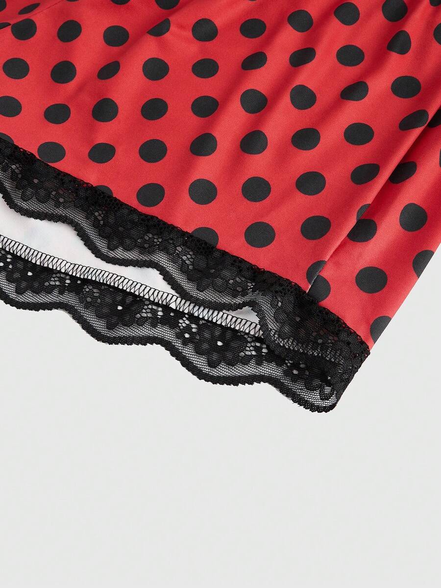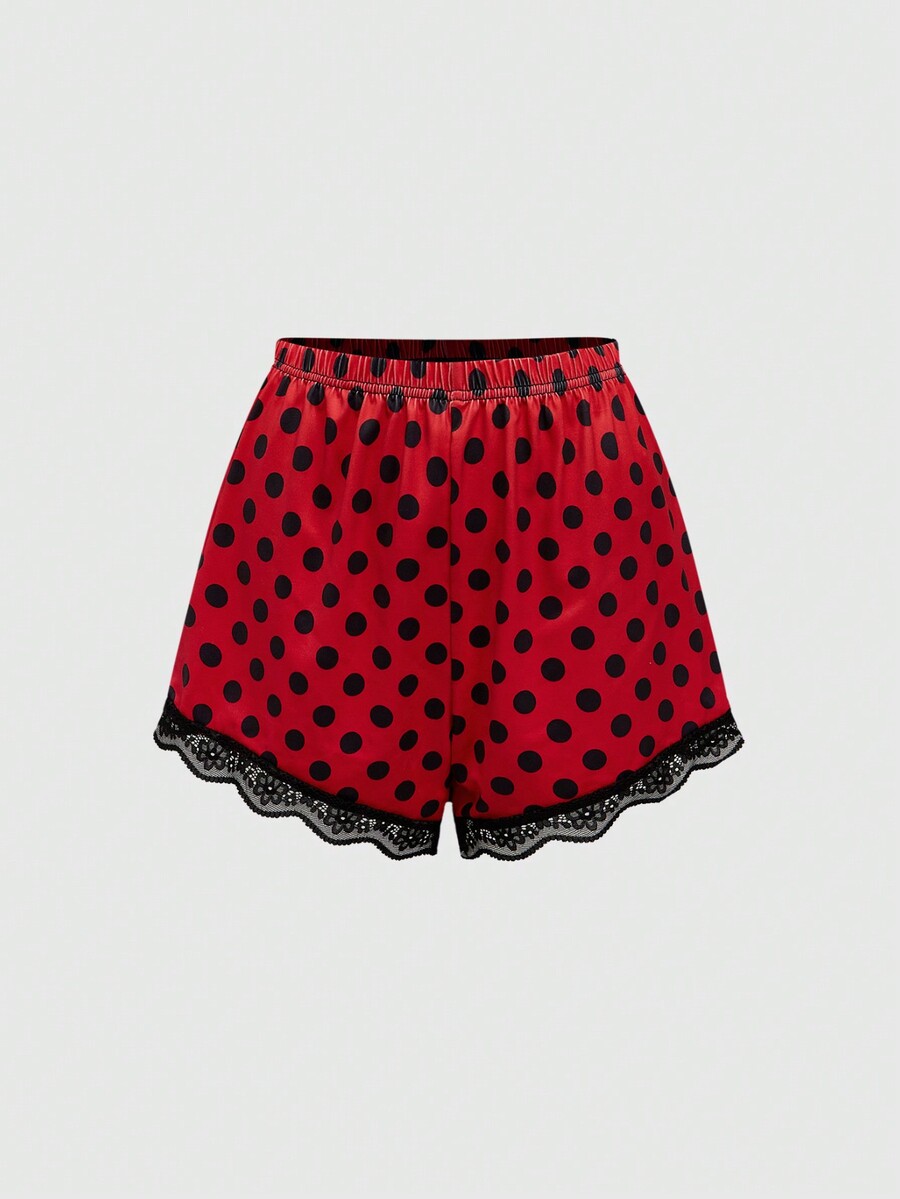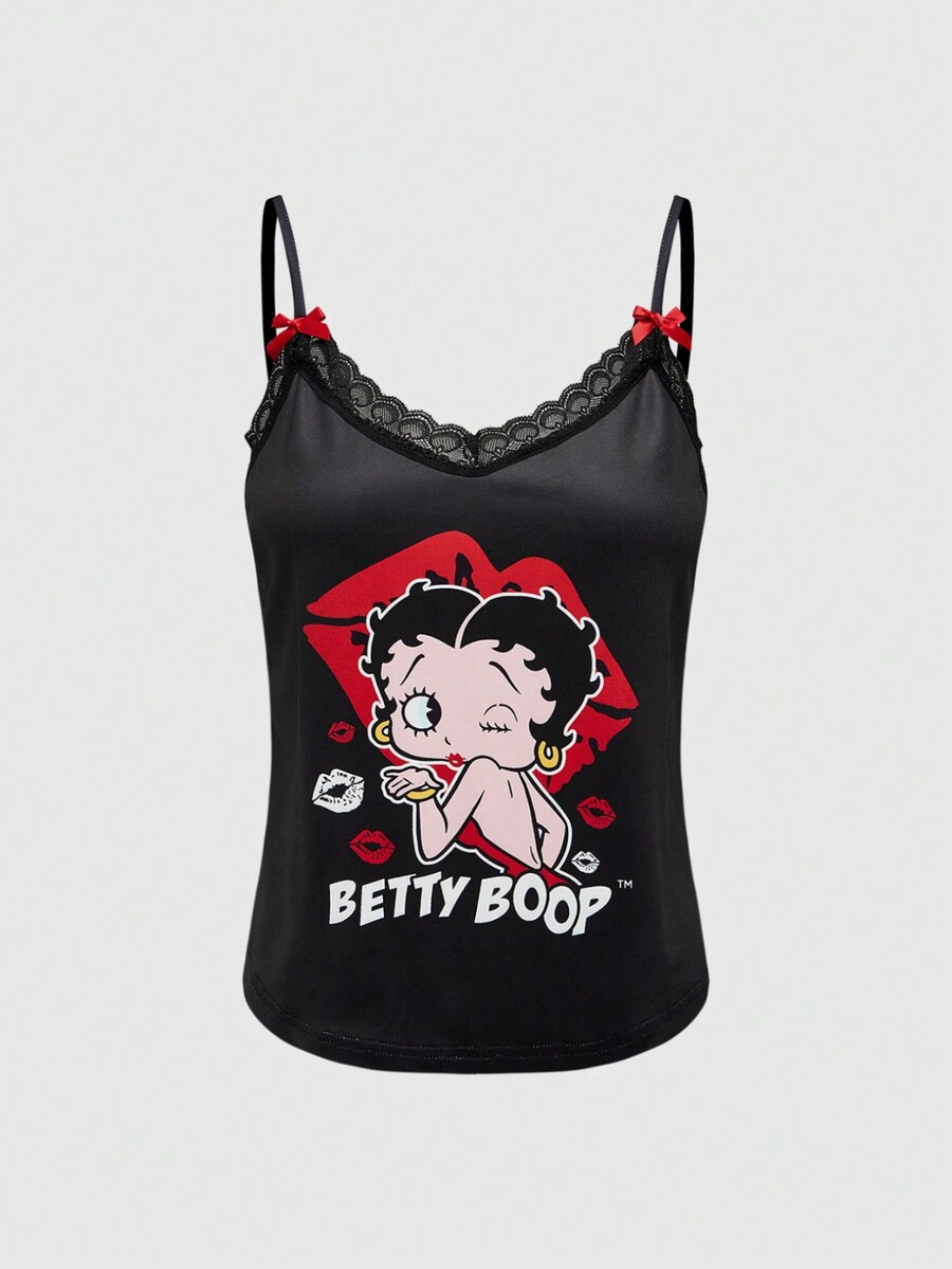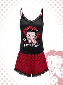 Betty Boop | ROMWE Conjunto de pijama cómodo de verano con camiseta de tirantes de encaje con estampado de personaje de dibujos animados y letras, y pantalones cortos a lunares para mujeres