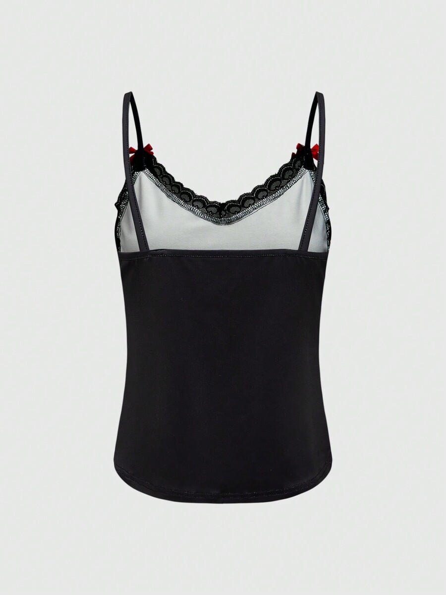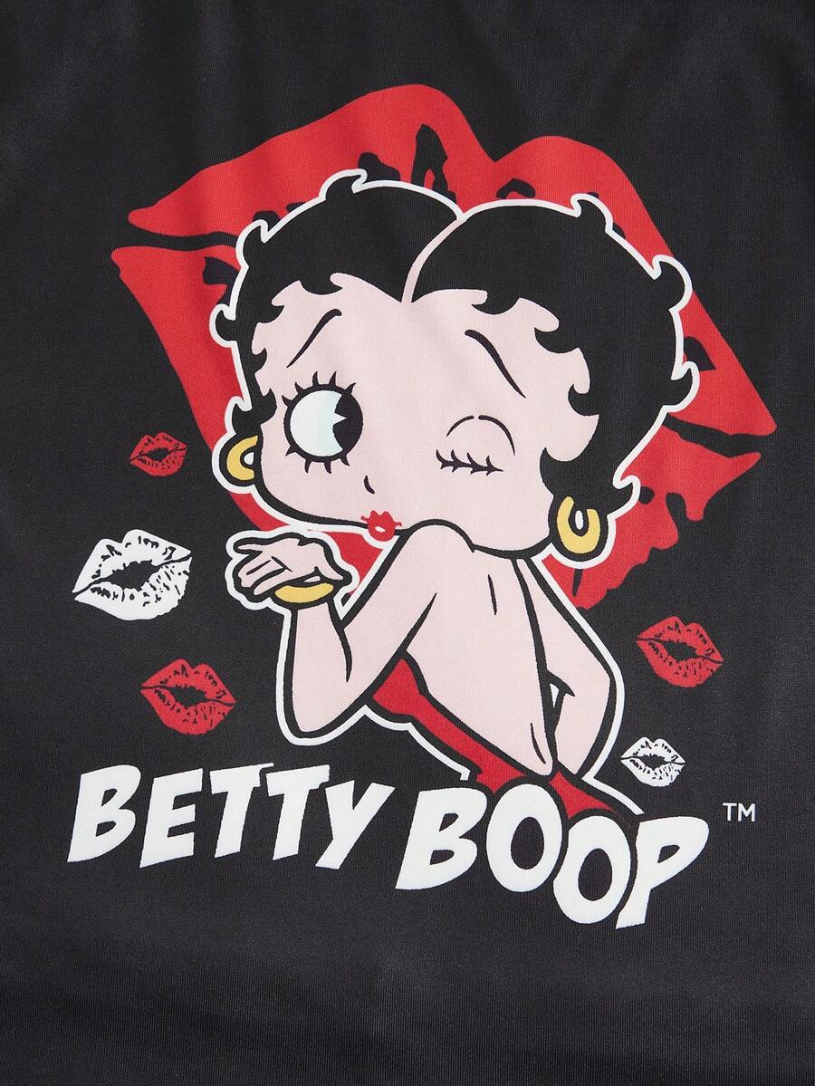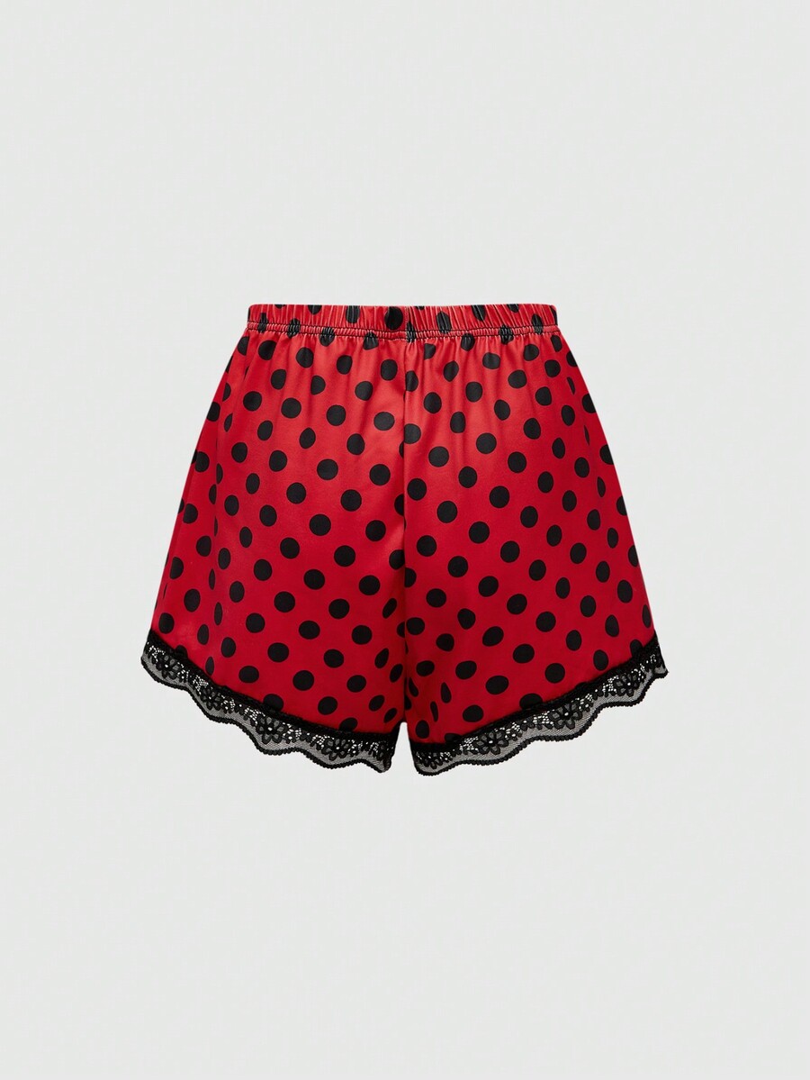 Betty Boop | ROMWE Conjunto de pijama cómodo de verano con camiseta de tirantes de encaje con estampado de personaje de dibujos animados y letras, y pantalones cortos a lunares para mujeres