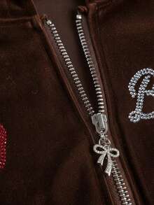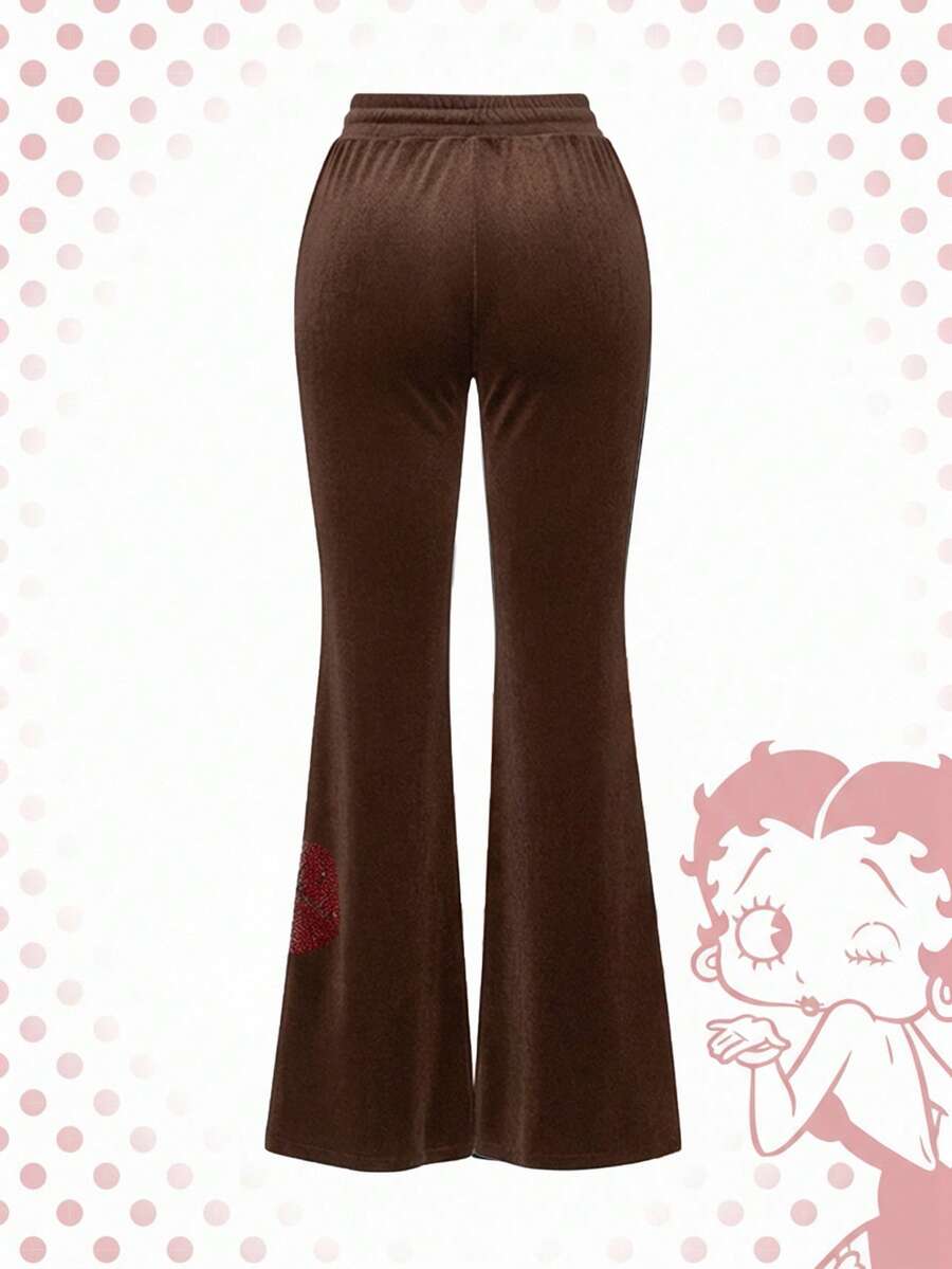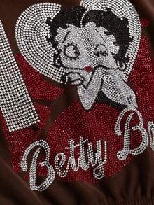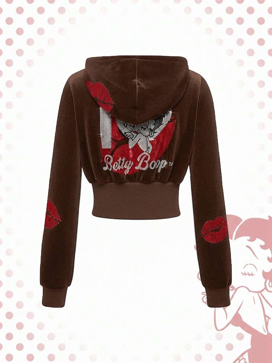 Betty Boop | ROMWE Conjunto de sudadera con capucha y pantalones de terciopelo con estampado de Betty con strass estilo Y2K