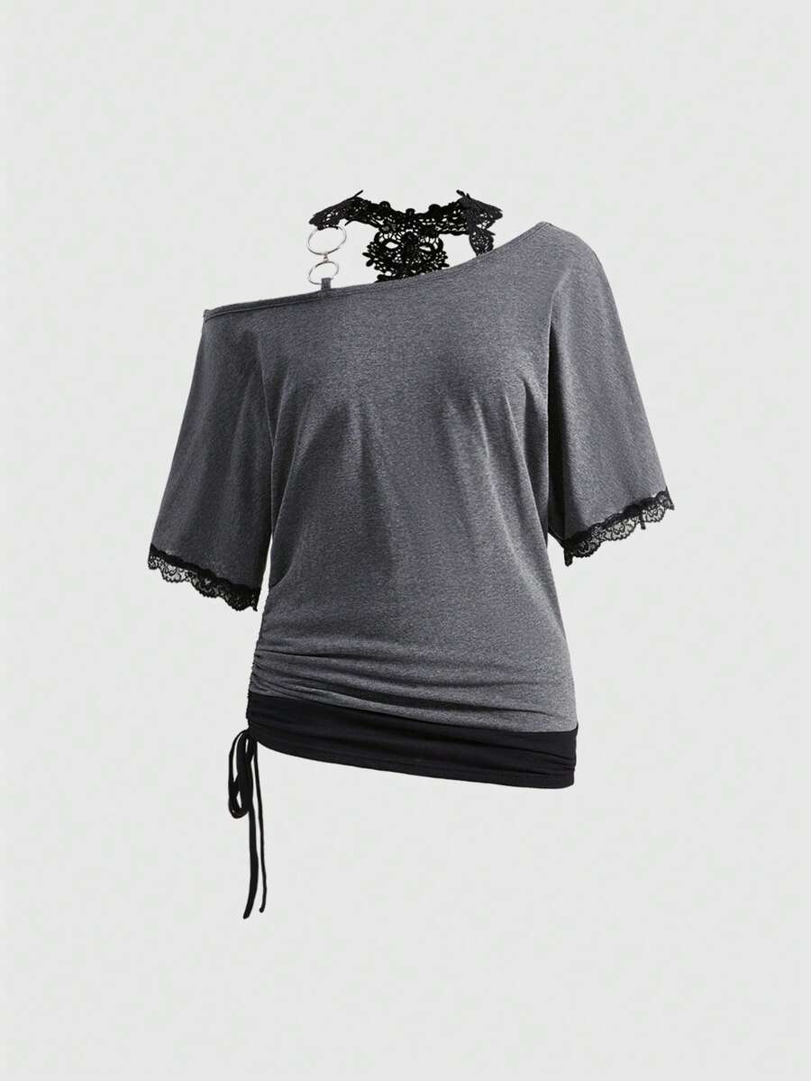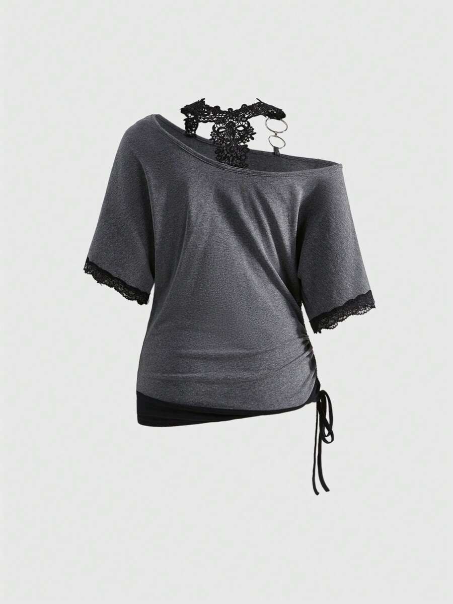 J-Fashion Camiseta holgada asimétrica de hombros con decoración de anillo de metal y encaje negro 2 en 1