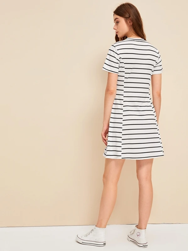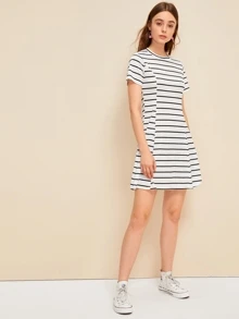 Vestido estilo camiseta bajo amplio de rayas negras y blancas