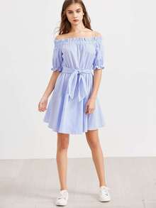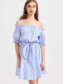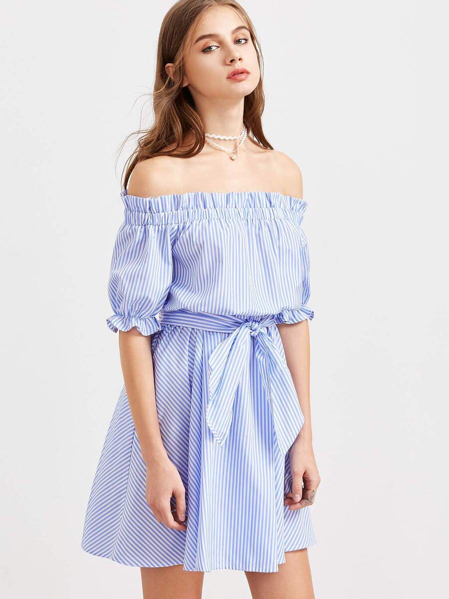 Vestido de rayas con detalle de volantes con hombro al aire - azul