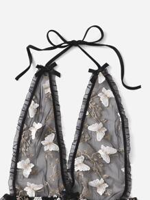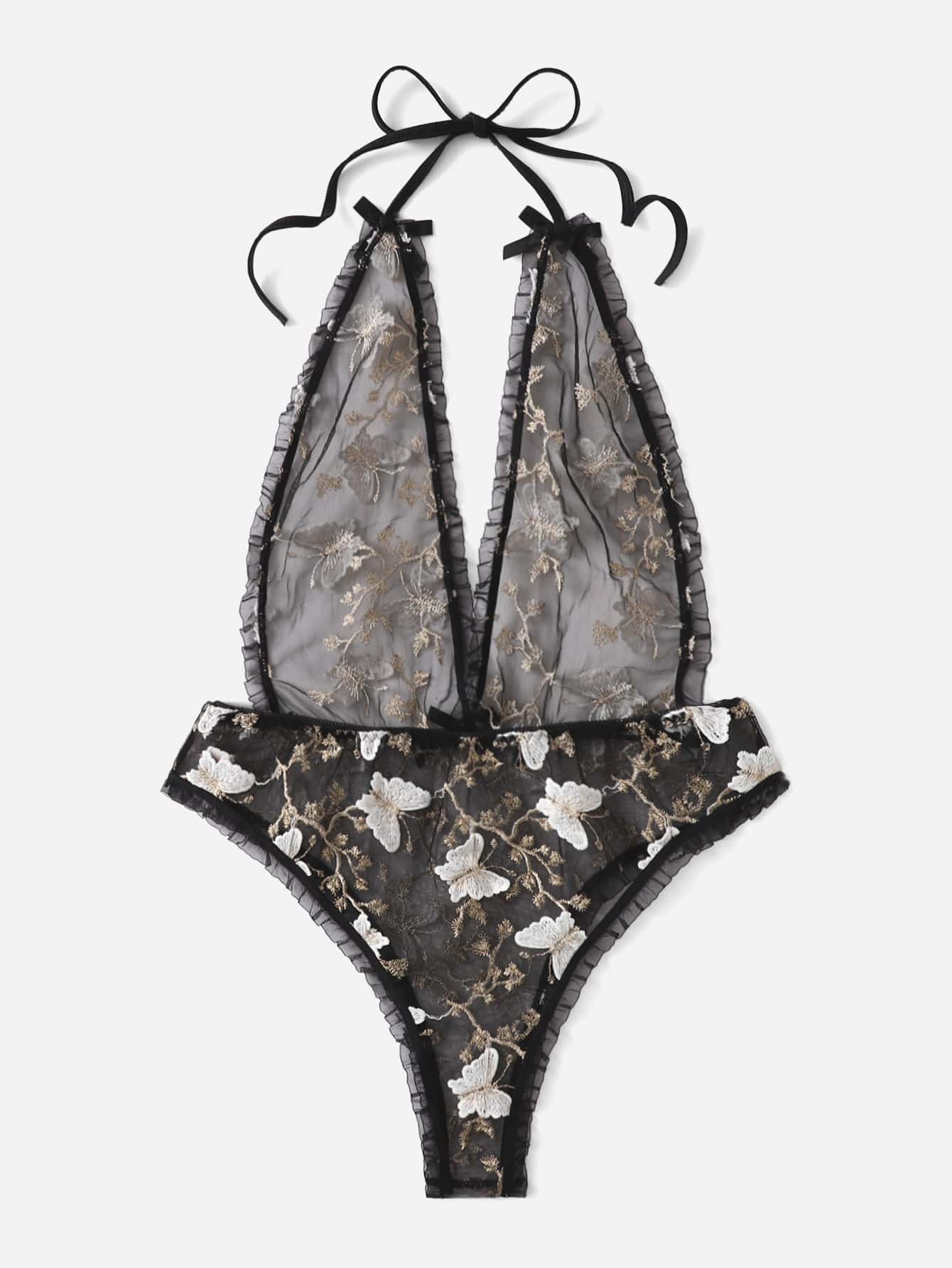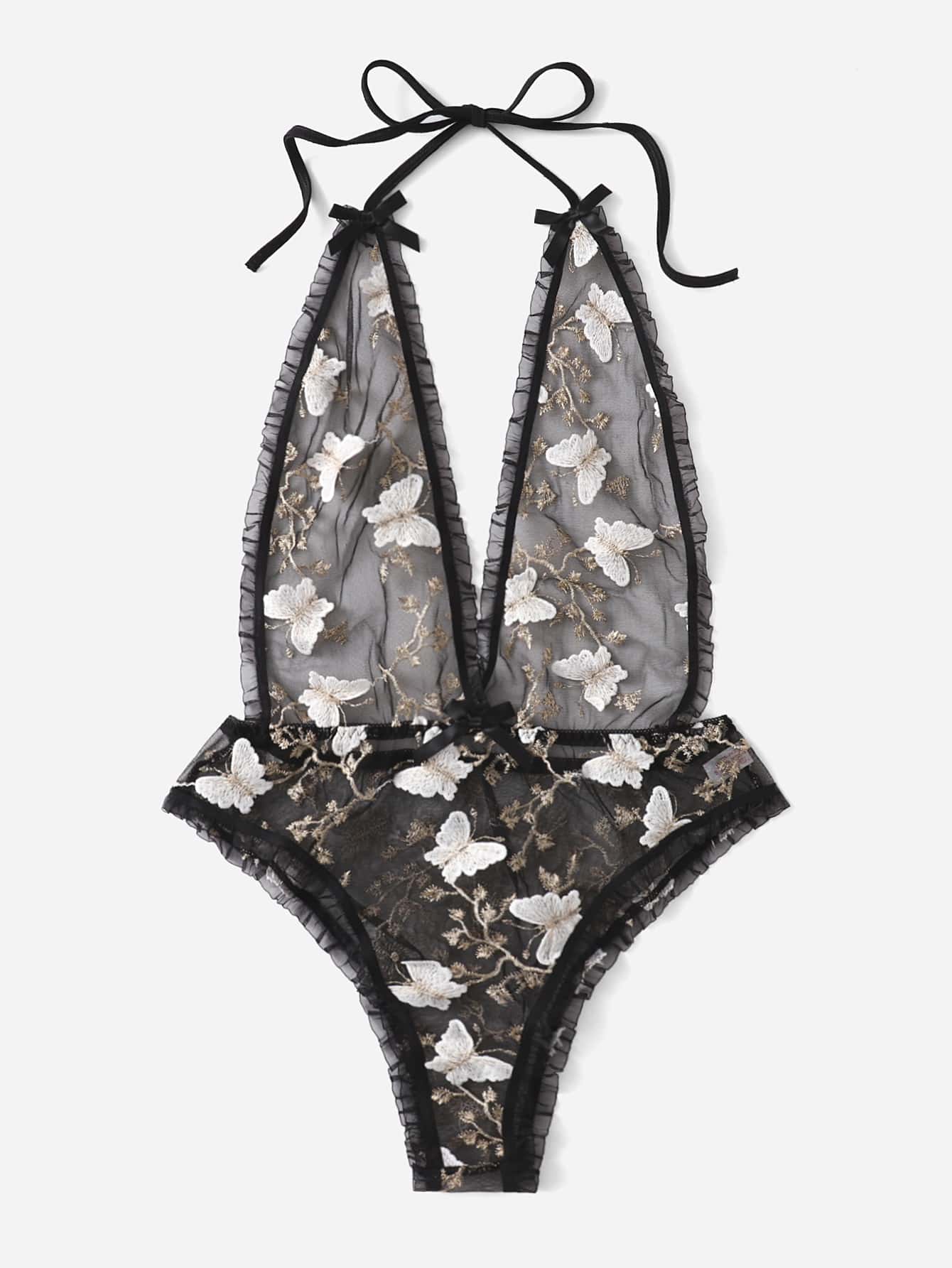 Body teddy con bordado de mariposa de malla de cuello profundo