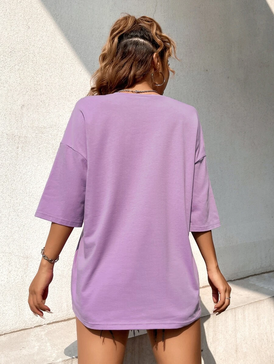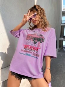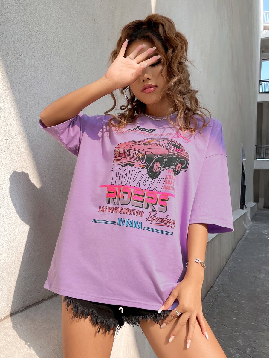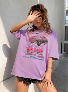 Camiseta de hombros caídos con estampado de coche y letra