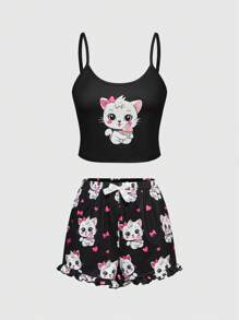 Conjunto de pijama con camiseta de tirantes y pantalones cortos con estampado de gato con lazo de dibujos animados