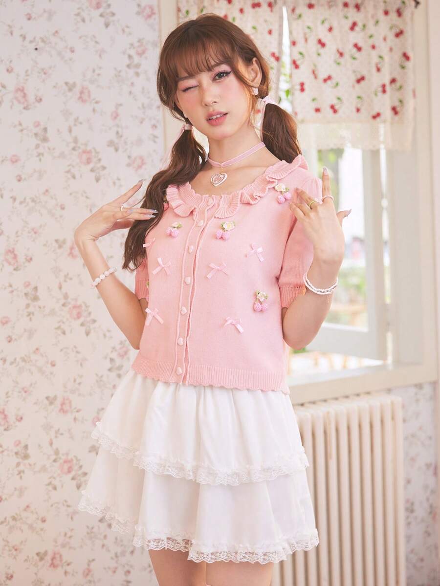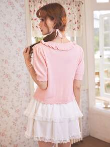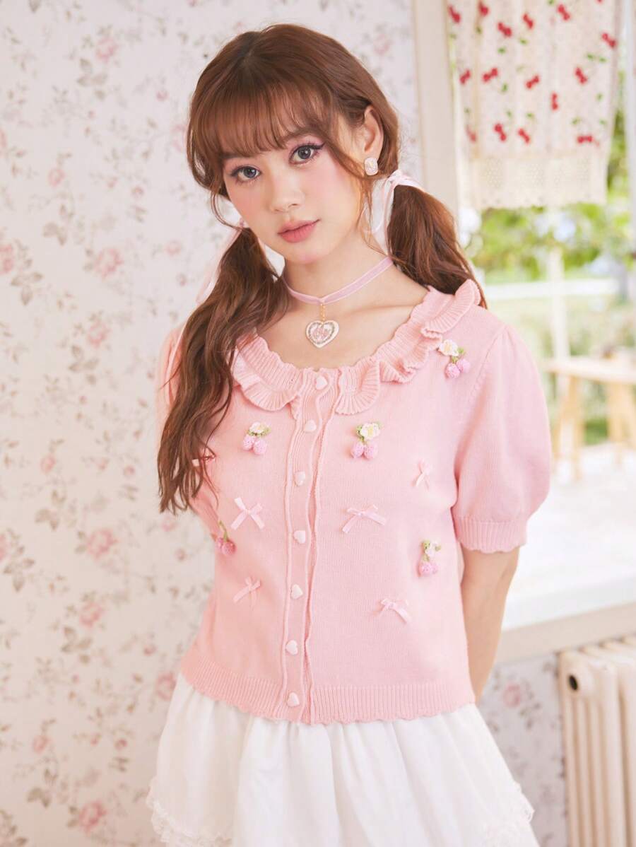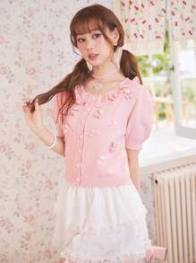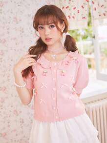 Kawaii Cárdigan con cereza con parche con diseño de lazo de manga farol