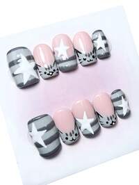 Anime 10 piezas de lindos elementos de gato estrella de viento de alta calidad, piezas de uñas falsas hechas a mano + 3 piezas de cinta adhesiva de doble cara, dulce contraste francés rosa y gris de viento francés, uñas cortas desmontables con forma de tubería de agua, piezas de uñas falsas reutilizables de alta calidad para todas las estaciones, adecuadas para fiestas, bailes y uso diario.