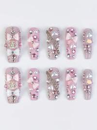 Anime 10 piezas de remaches con estilo Y2K, armadura francesa pintada a mano de colores, elemento de pegatina de lazo de rosa de alta calidad, pieza de uña postiza extraíble con forma de almendra súper larga, se puede reutilizar en todas las estaciones, adecuada para uso diario, salir a citas