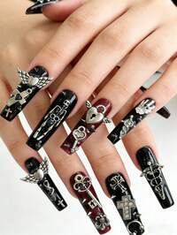 Goth 10 piezas largo ataúd ángel & con diseño de diamante de imitación Uña postiza Kit
