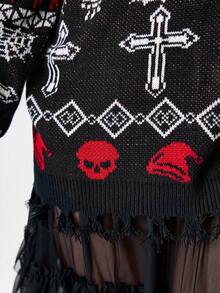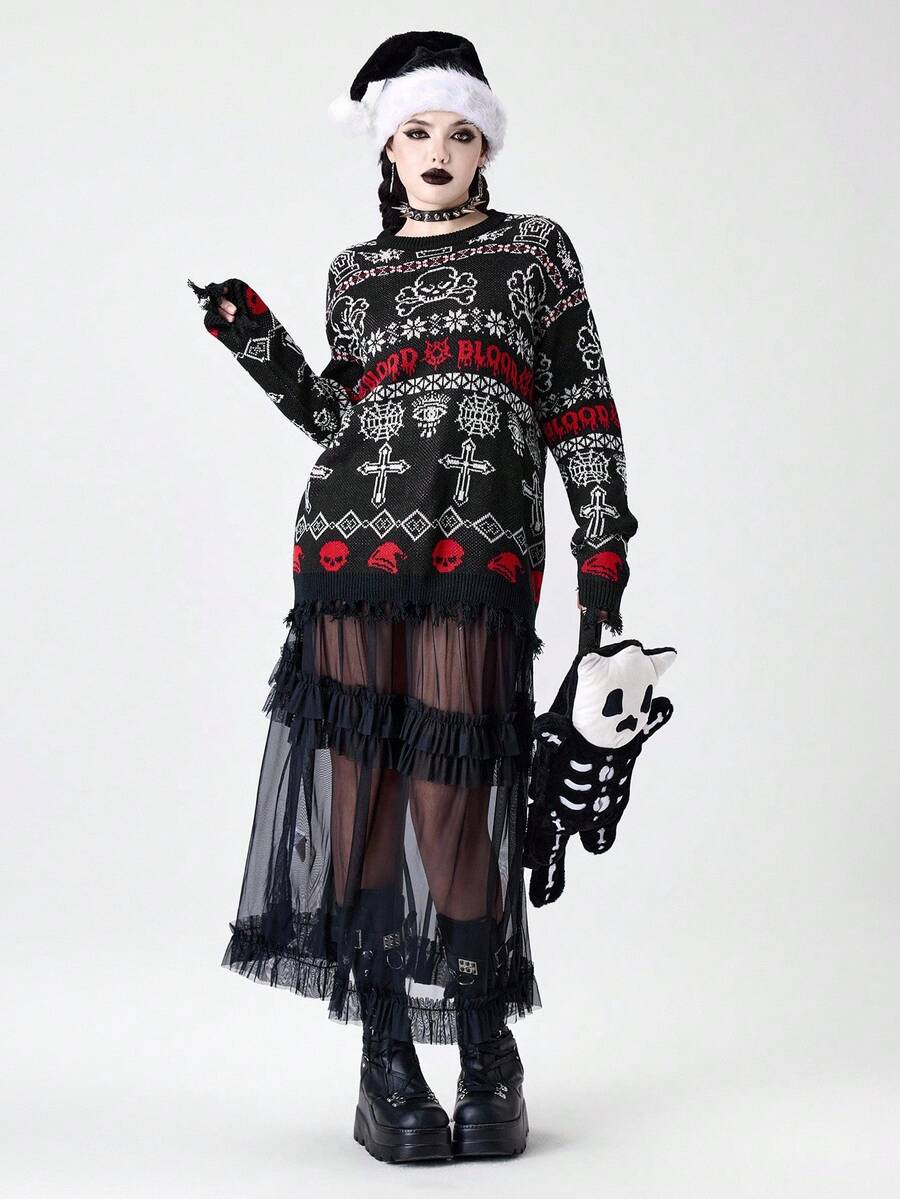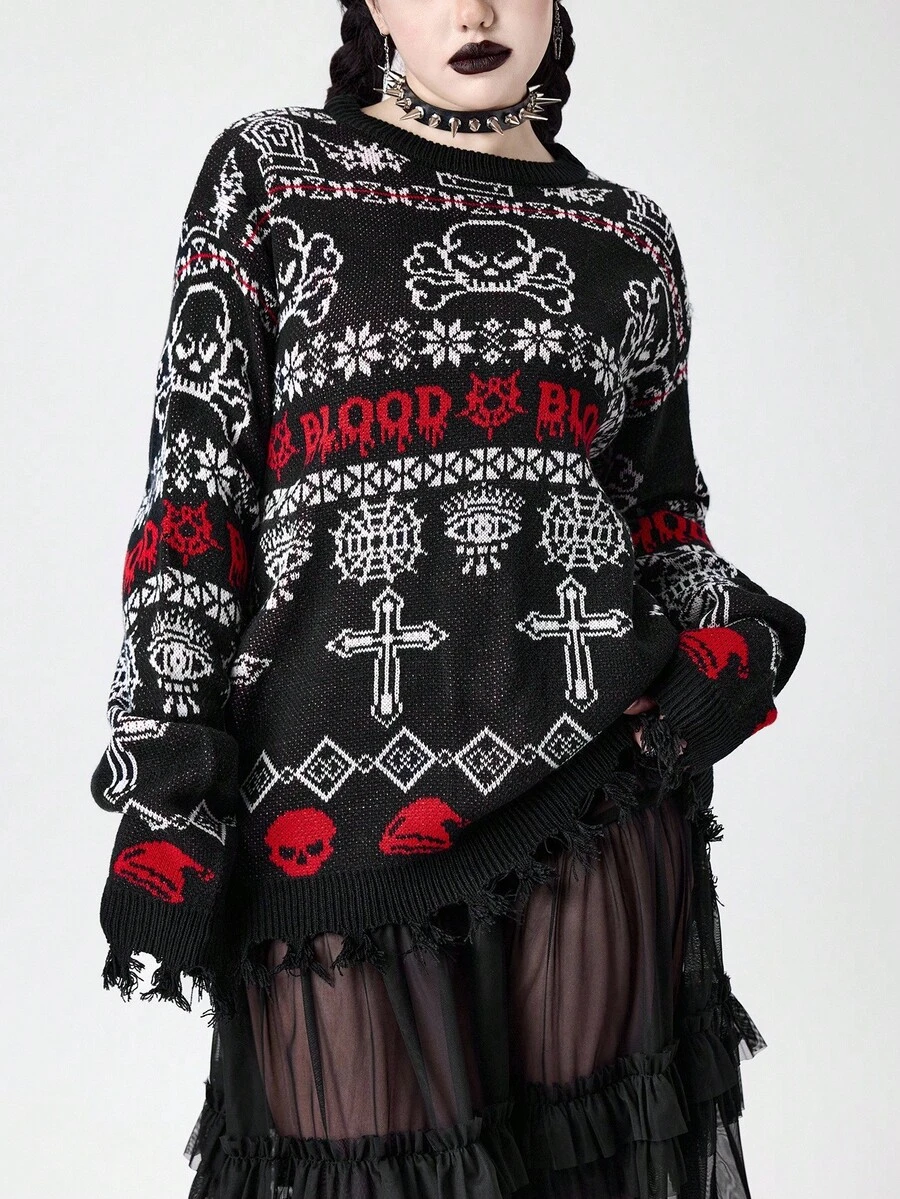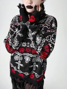 Goth Suéter holgado para mujer con estampado jacquard de esqueleto gótico, murciélago, cabeza de toro, copo de nieve, cruz de estilo Fair Isle y telaraña