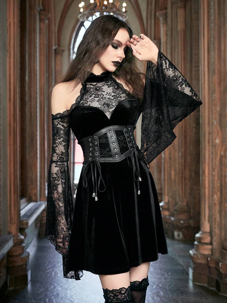 Vestido gótico de terciopelo sin corsé de hombros descubiertos con encaje en contraste, para la escuela