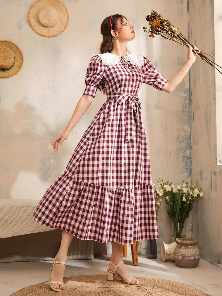 Vestido en contraste de cuello bobo con estampado de guingán con cinturón bajo con fruncido