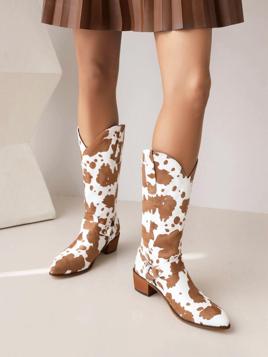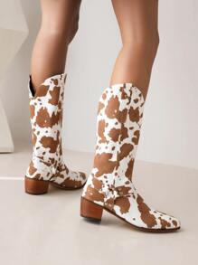 Botas cowboy con patrón de vaca con diseño de tachuela con tacón grueso sintética