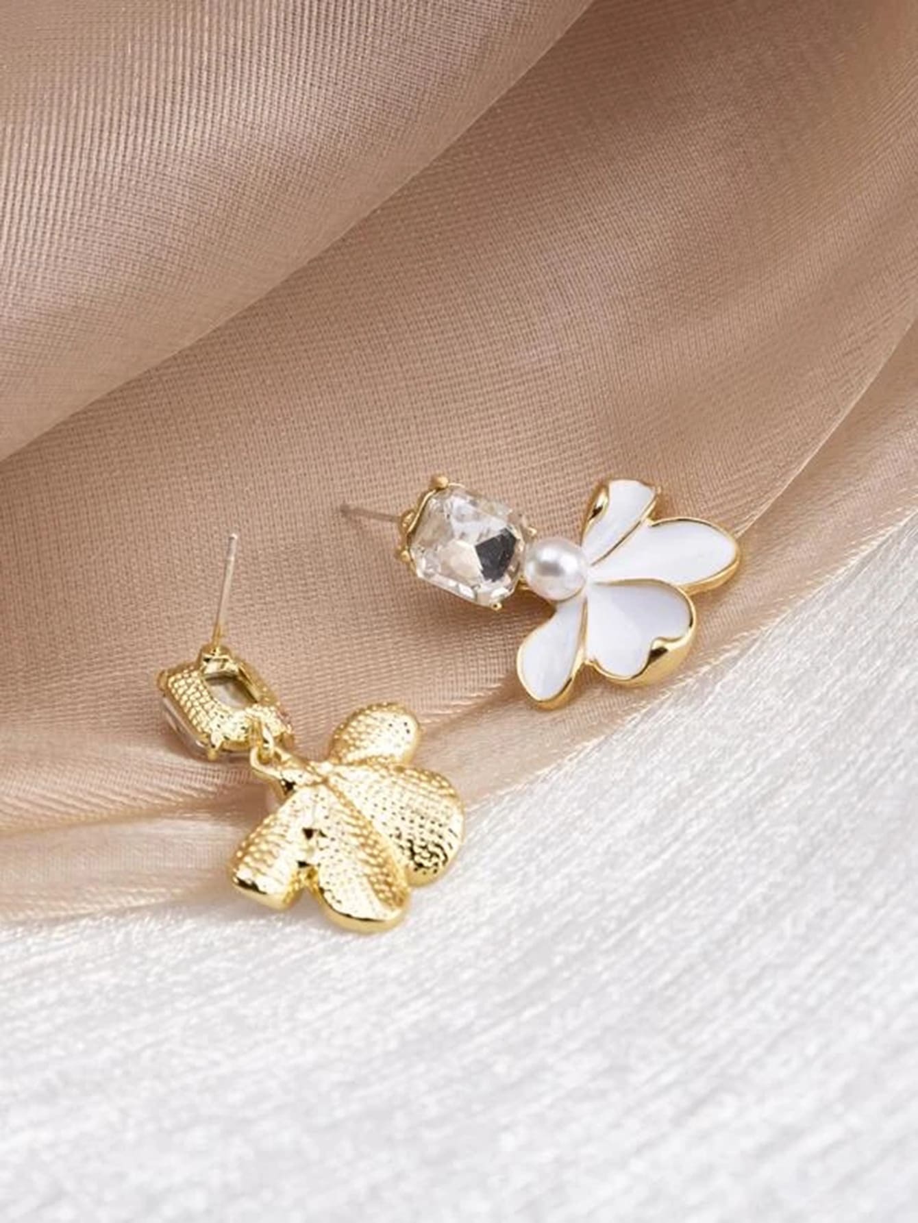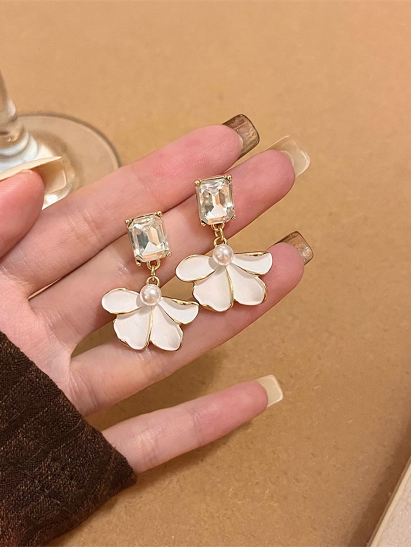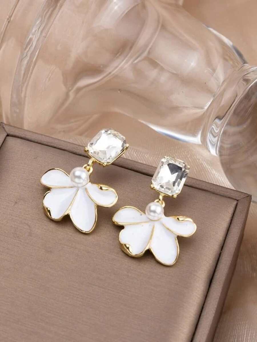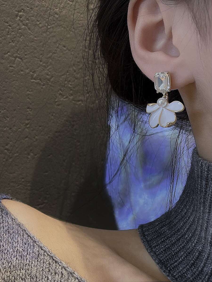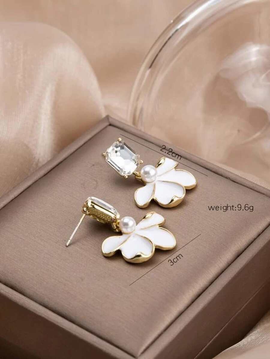 Pendientes largos zirconia cúbica & con diseño de perla artificial flor
