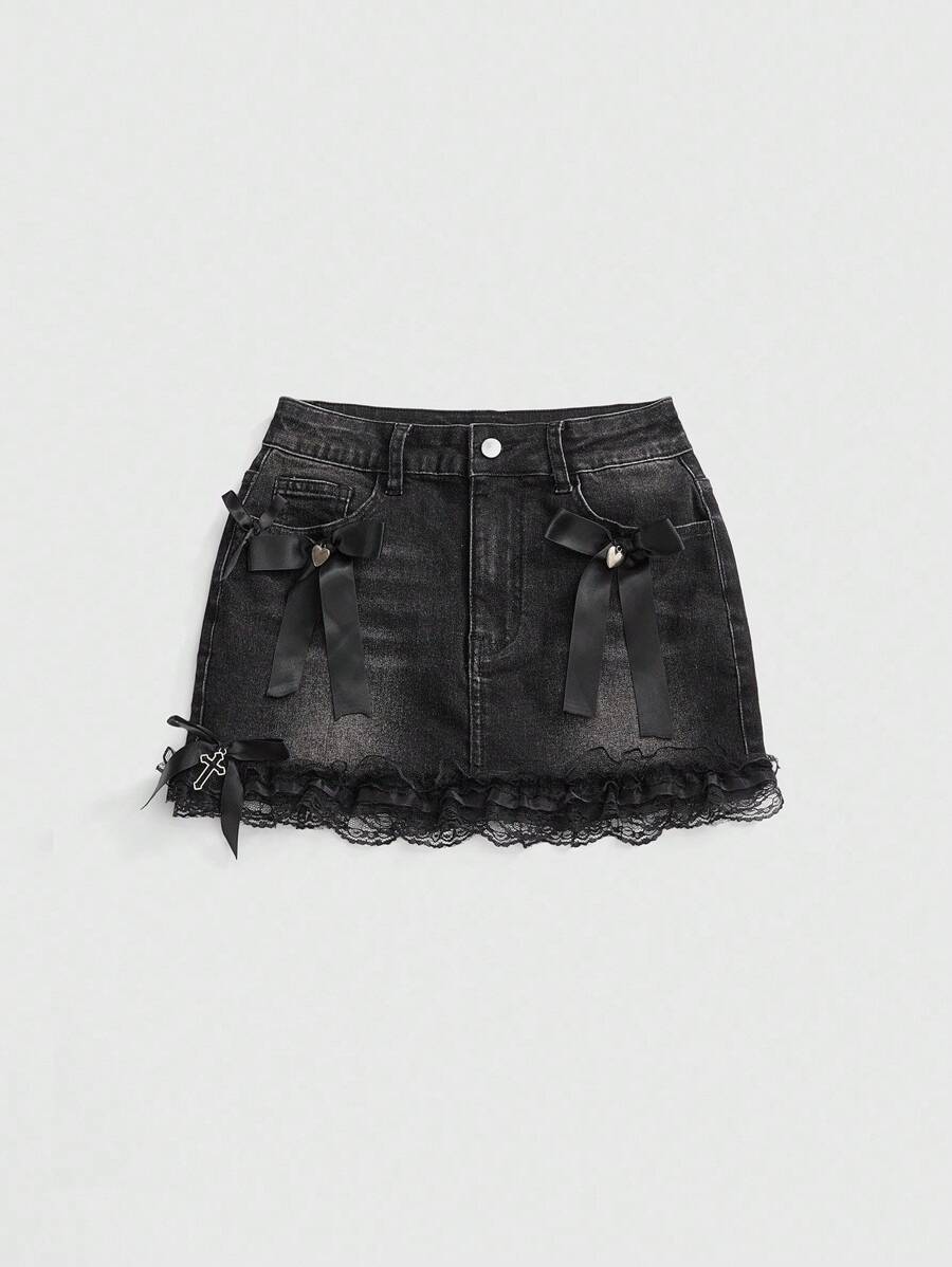 Grunge Punk Minifalda de mezclilla ajustado con lazo de encaje estilo lindo y kawaii para mujeres