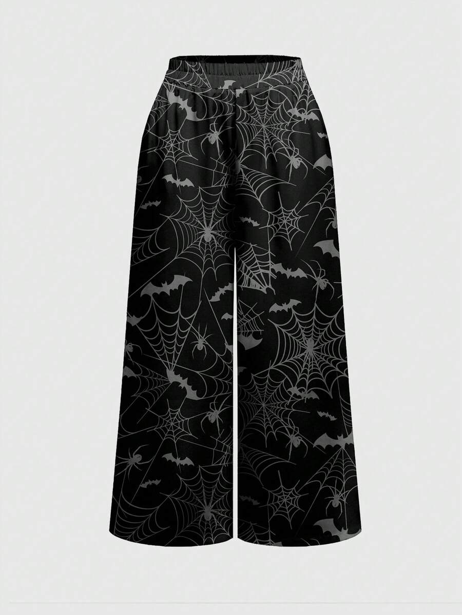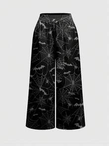 Goth Pantalones de pierna ancha y larga con estampado de telaraña de murciélago de bosque oscuro para mujeres, tema misterioso de terror de Halloween