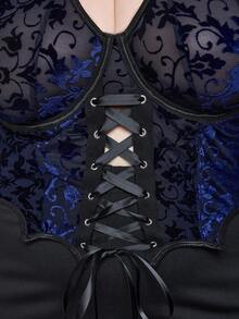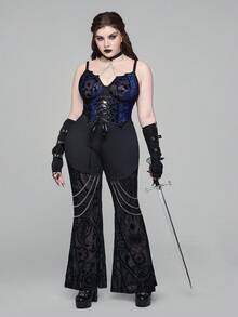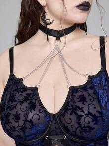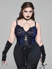 EDITION Camiseta y top sin mangas de terciopelo azul floral con decoración de cadena de cuello de murciélago gótico oscuro para mujer de talla grande