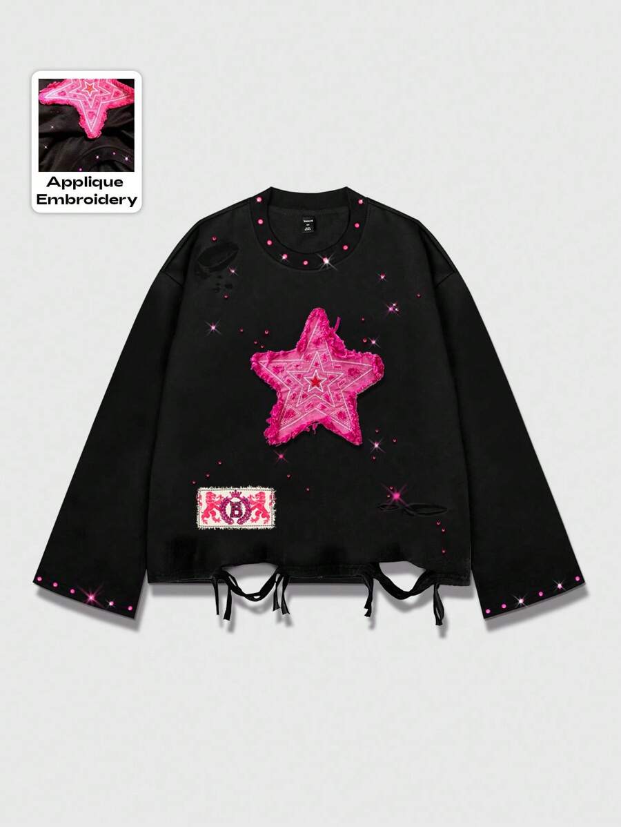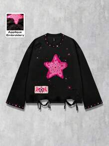 Grunge Punk Camiseta de manga larga oversize con parches bordados de estilo vintage desgastado y punk para hombres, otoño, estilo de los 2000