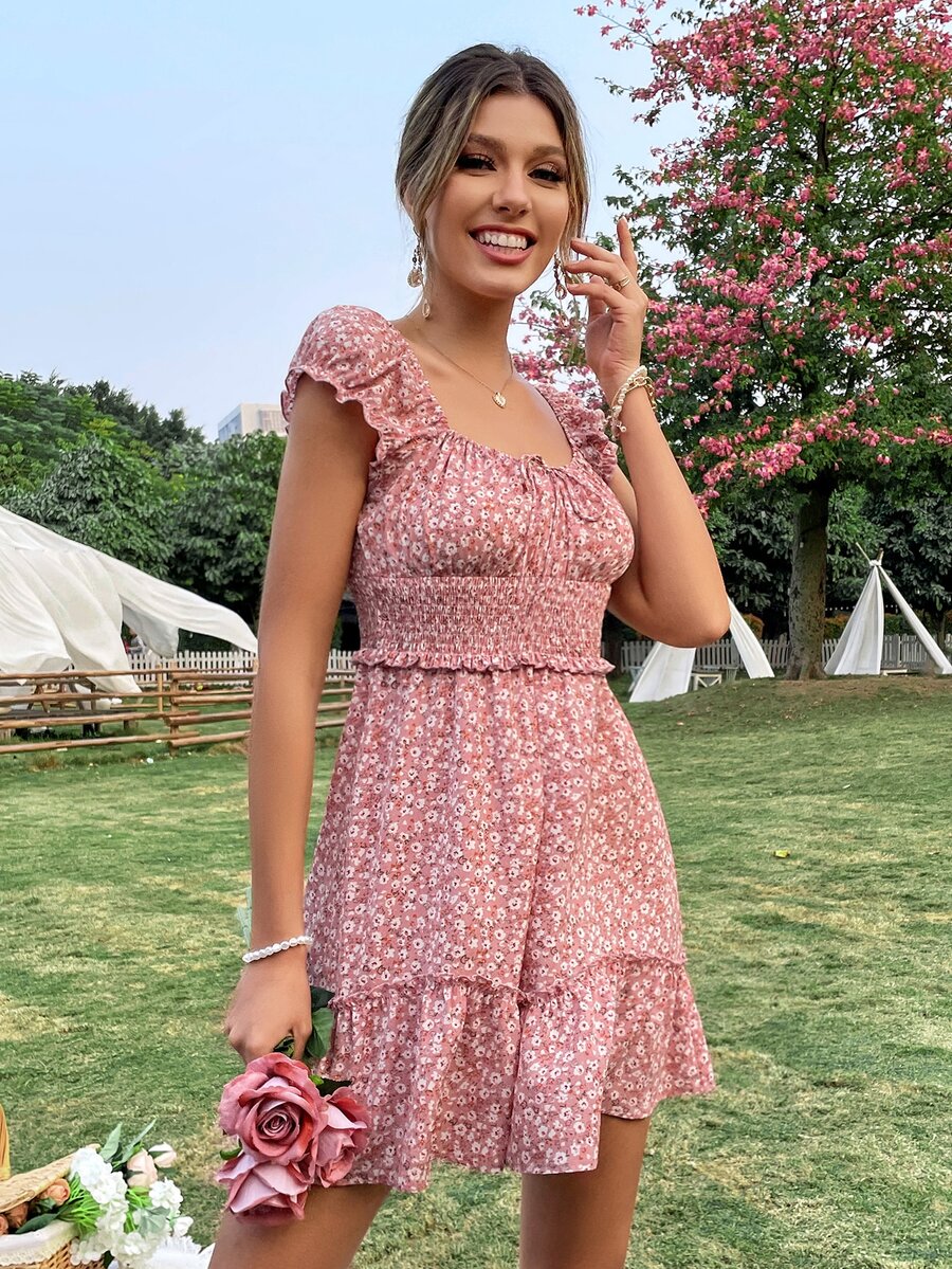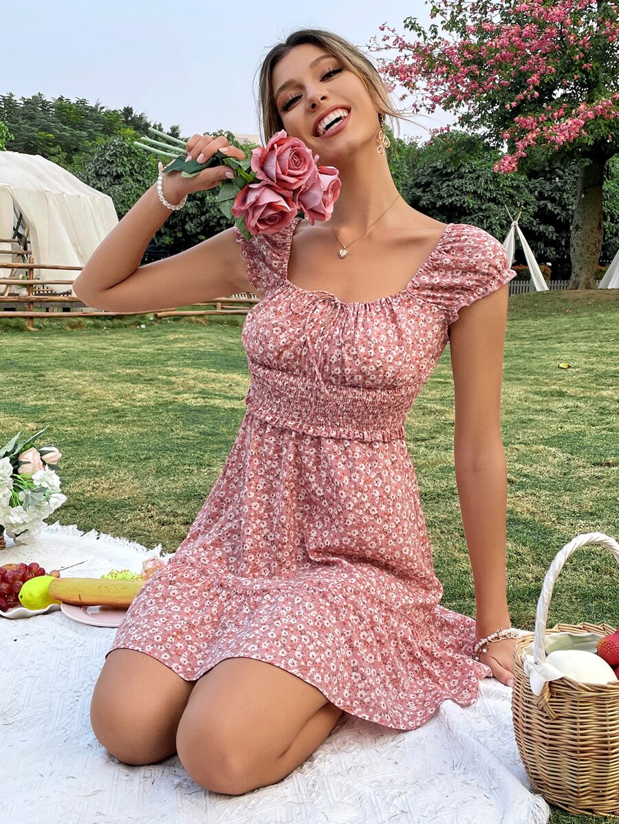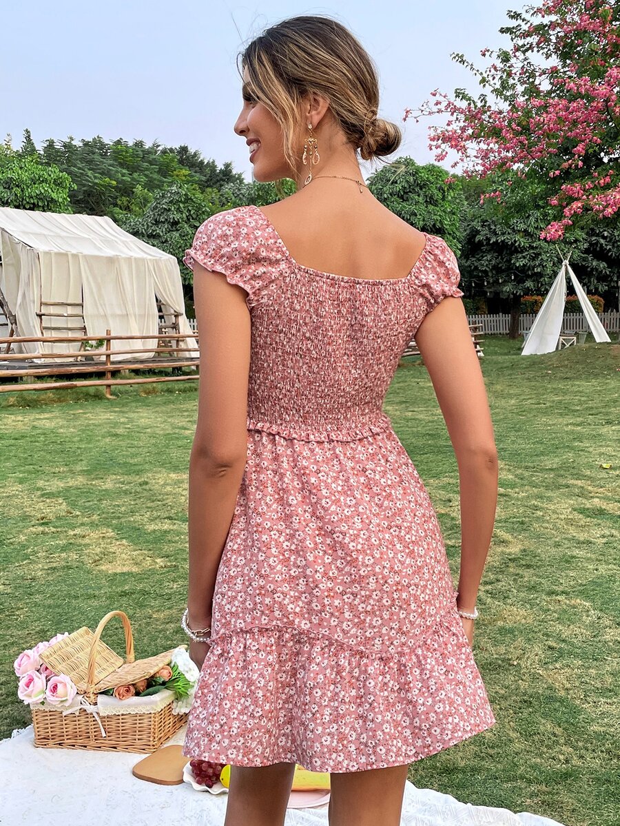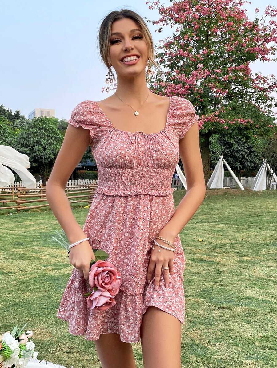 Vestido floral con nudo pecho con fruncido de cintura fruncido