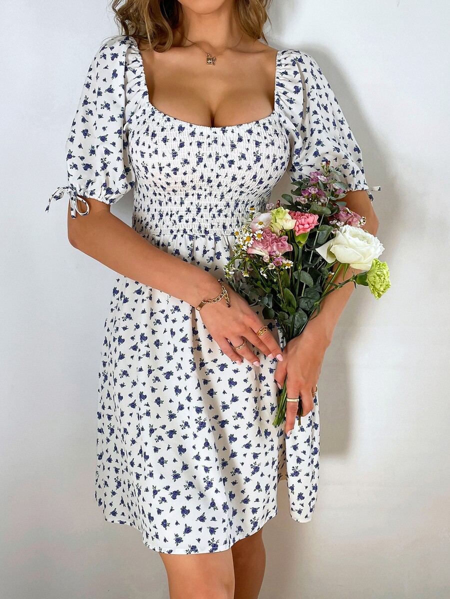 Vestido con fruncido con estampado floral con nudo de manga farol