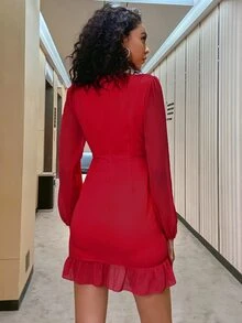 Double Crazy Vestido de manga farol de cuello en V de unicolor con volante en el bajo para mujer