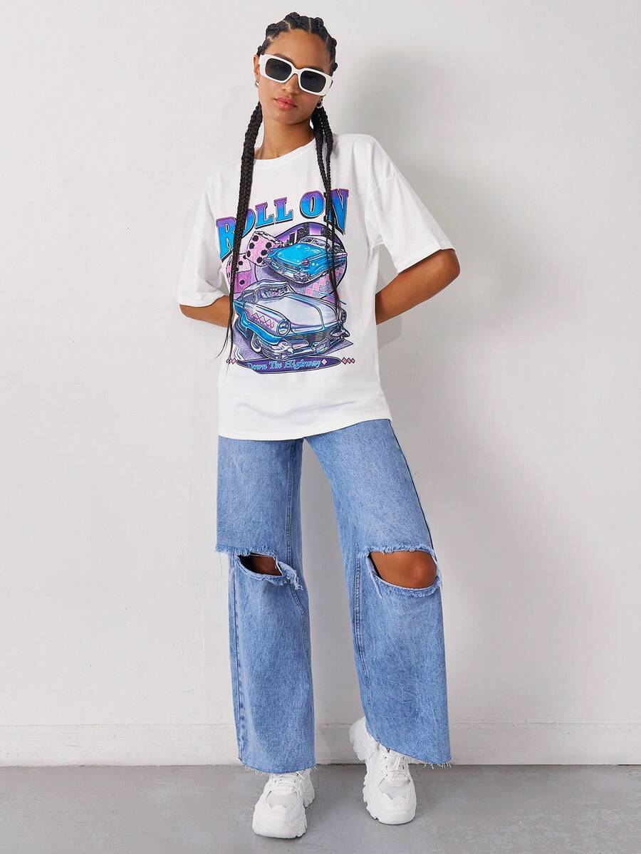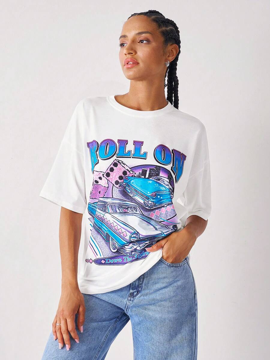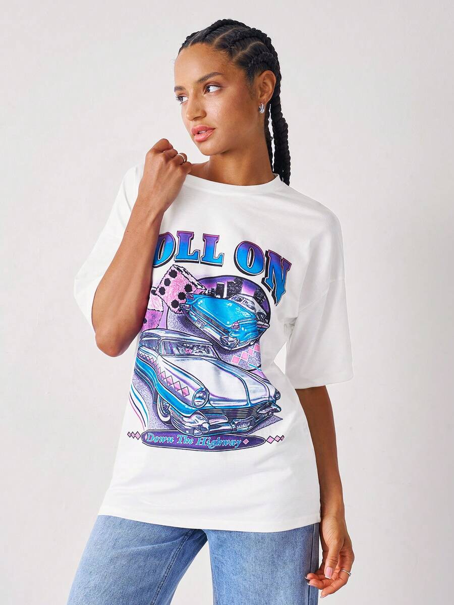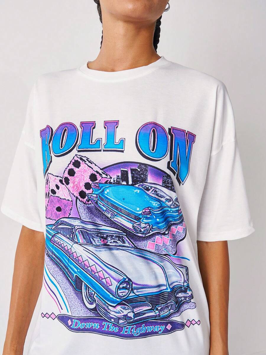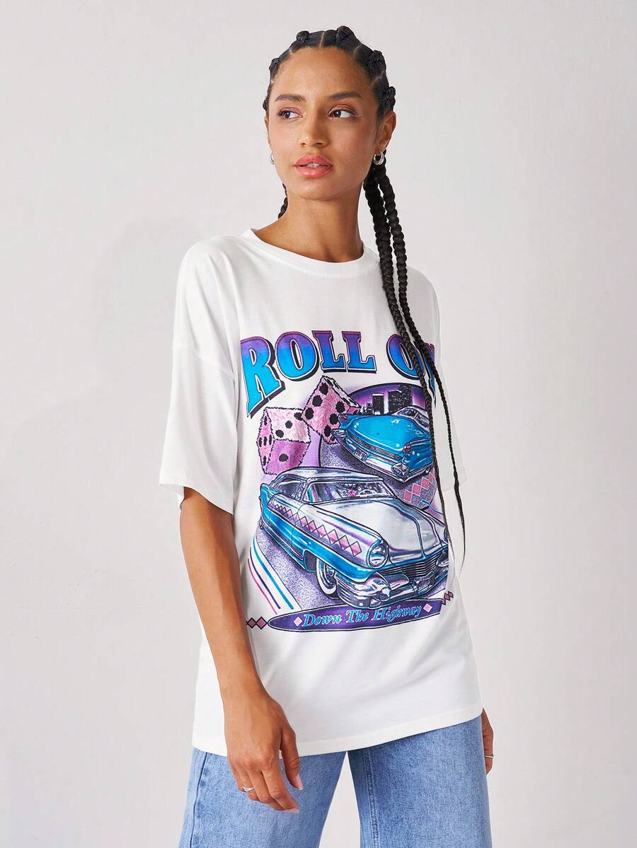 Camiseta larga con estampado de letra y coche de hombros caídos