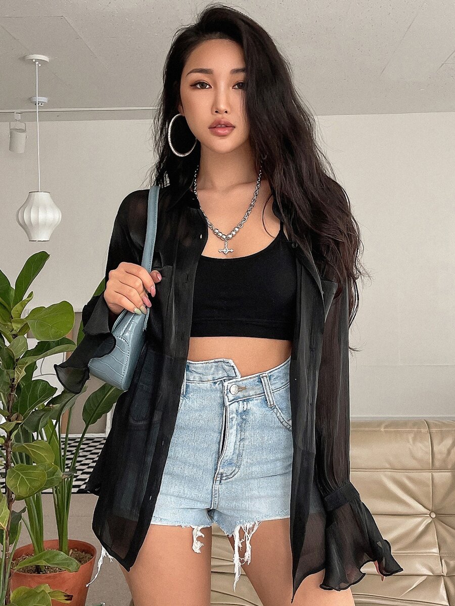 Camisa con bolsillos dobles y mangas con volantes, ropa de mujer de otoño con manga larga