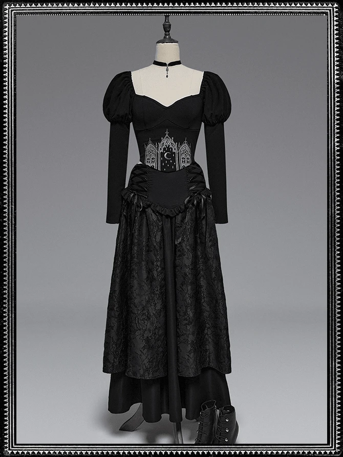 EDITION Blusa de mujer con bordado de luna y estrella de vidrio de catedral gótica negra, manga gigot, para Halloween