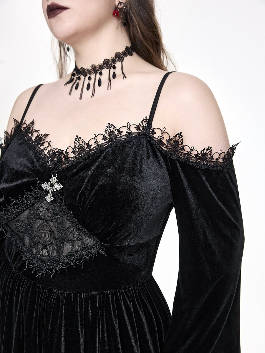 EDITION Vestido maxi de terciopelo de talla grande con hombros descubiertos, mangas acampanadas y abertura alta, con bordado de estilo gótico oscuro y de iglesia palaciega para Halloween