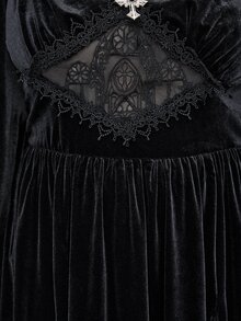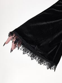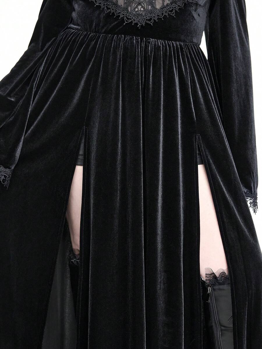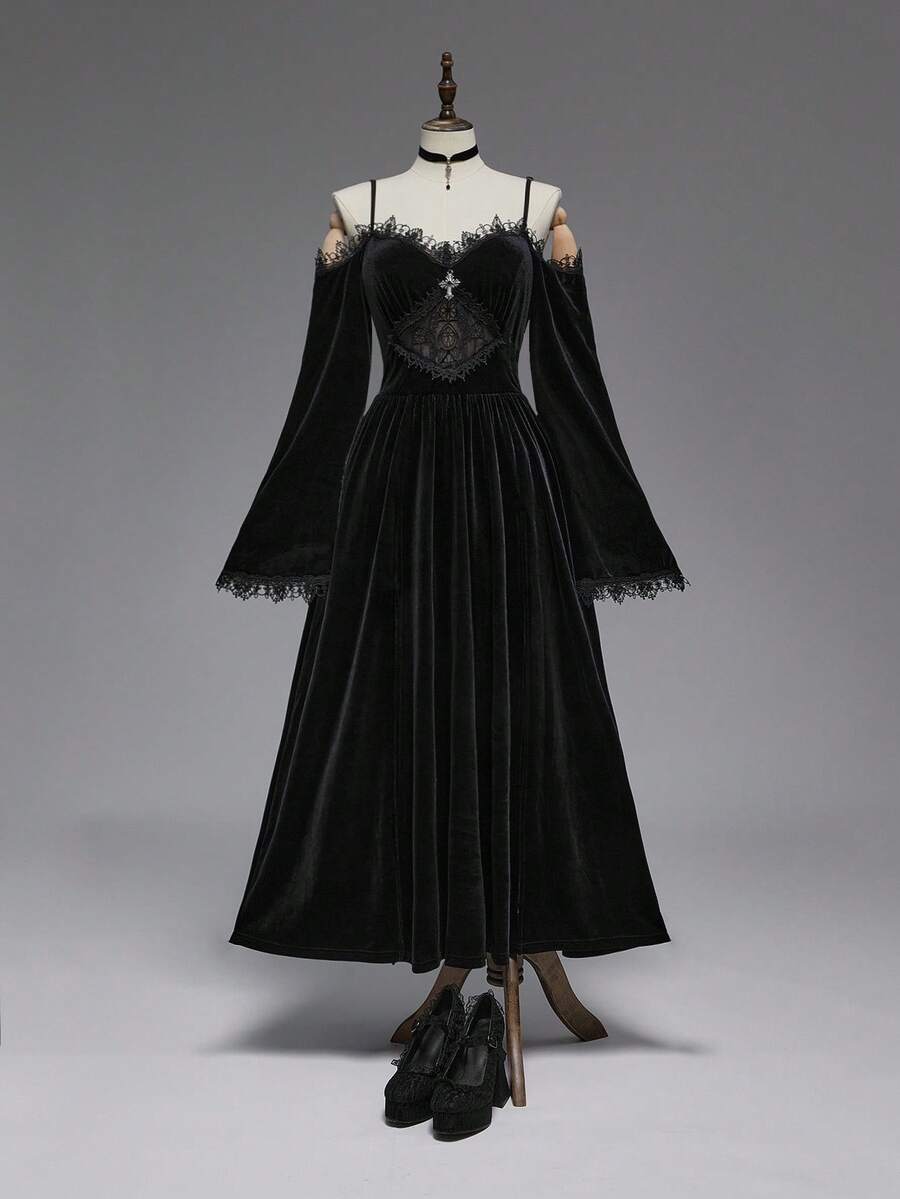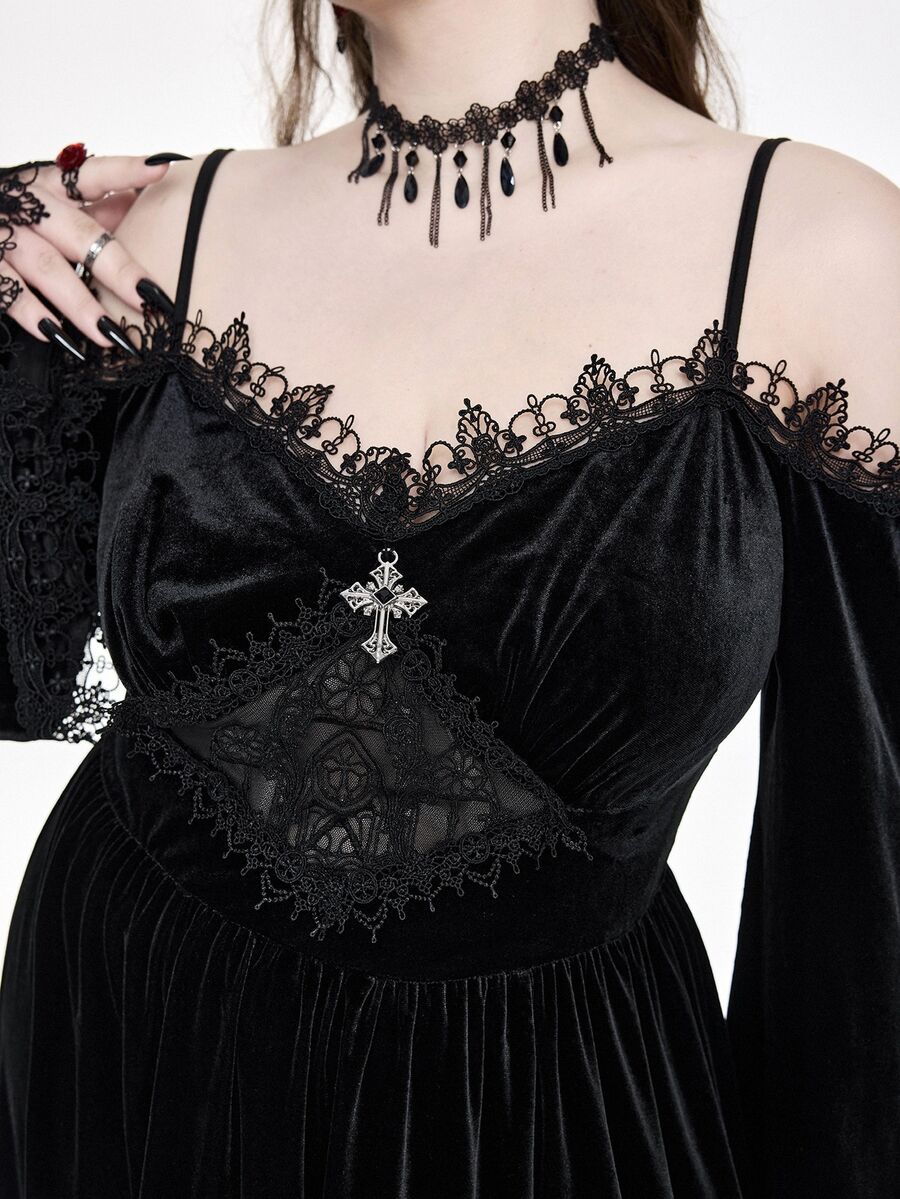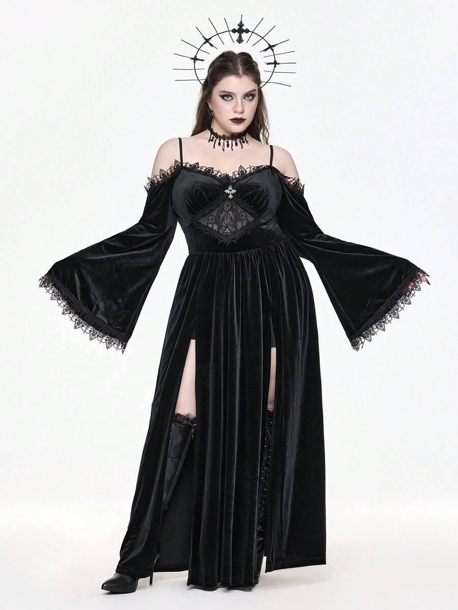 EDITION Vestido maxi de terciopelo de talla grande con hombros descubiertos, mangas acampanadas y abertura alta, con bordado de estilo gótico oscuro y de iglesia palaciega para Halloween