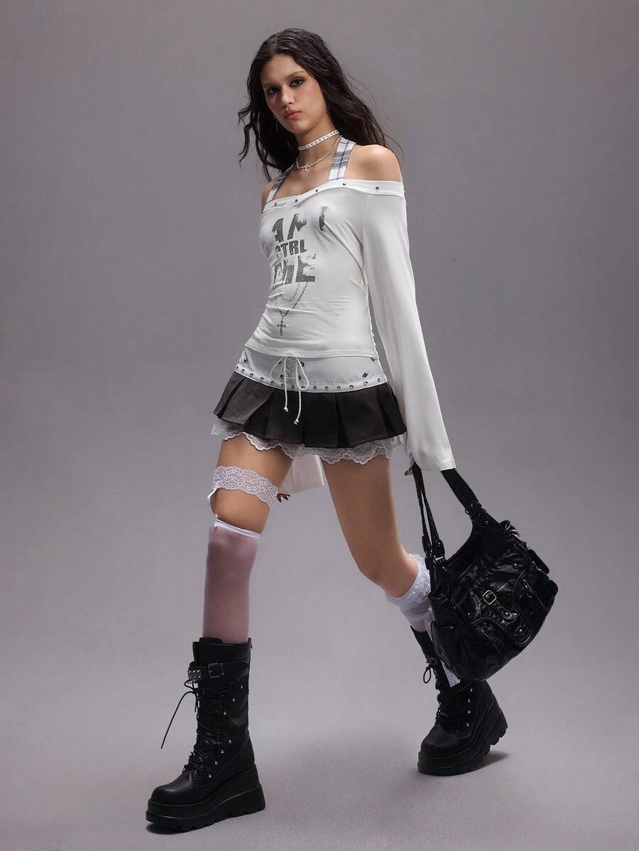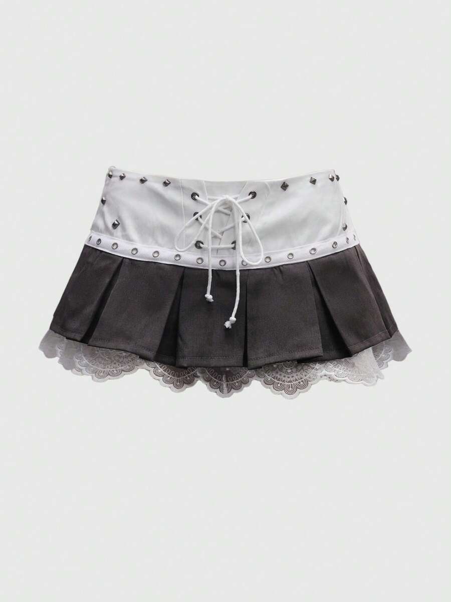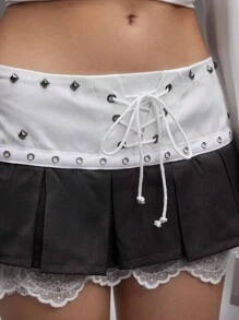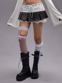 EDITION Minifalda plisada con diseño de remaches, encaje y parches en estilo romántico punk