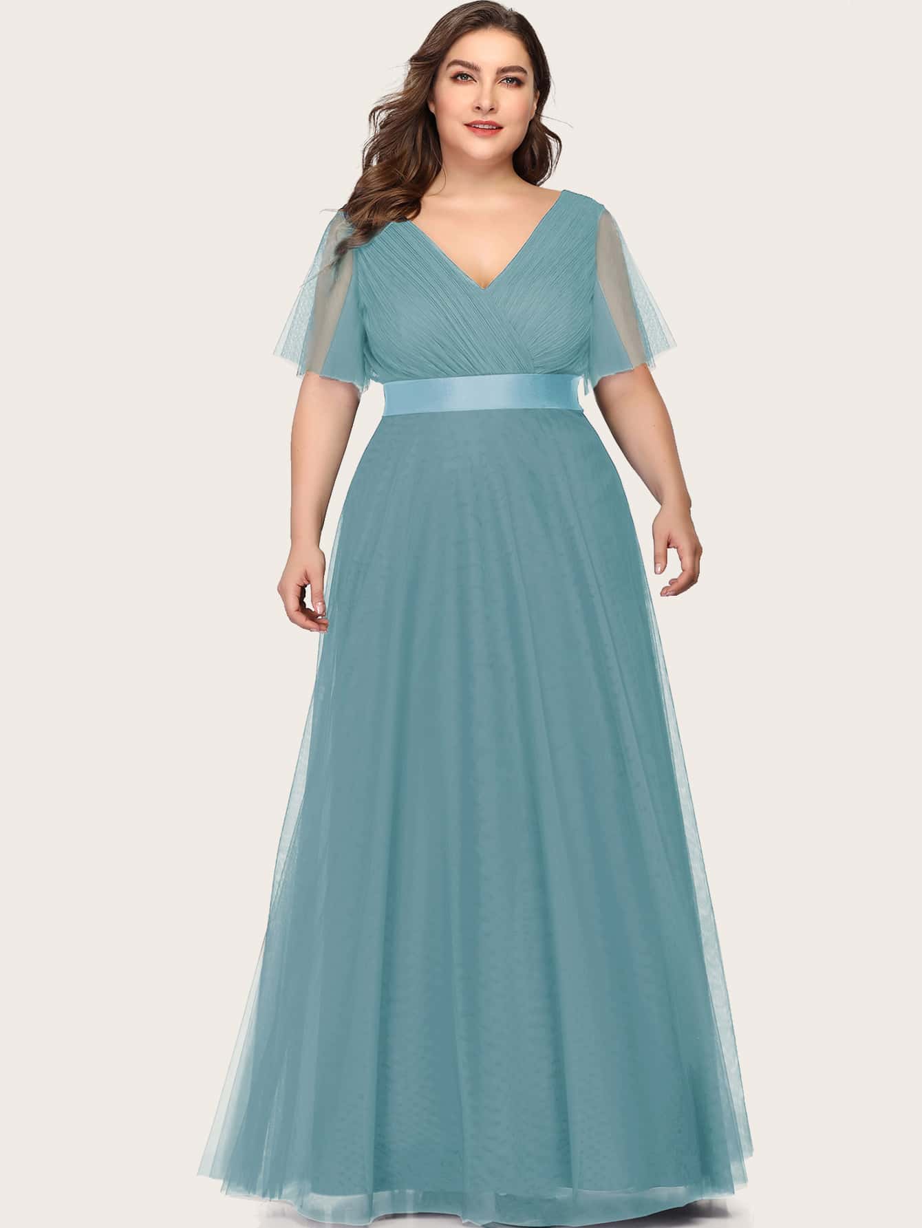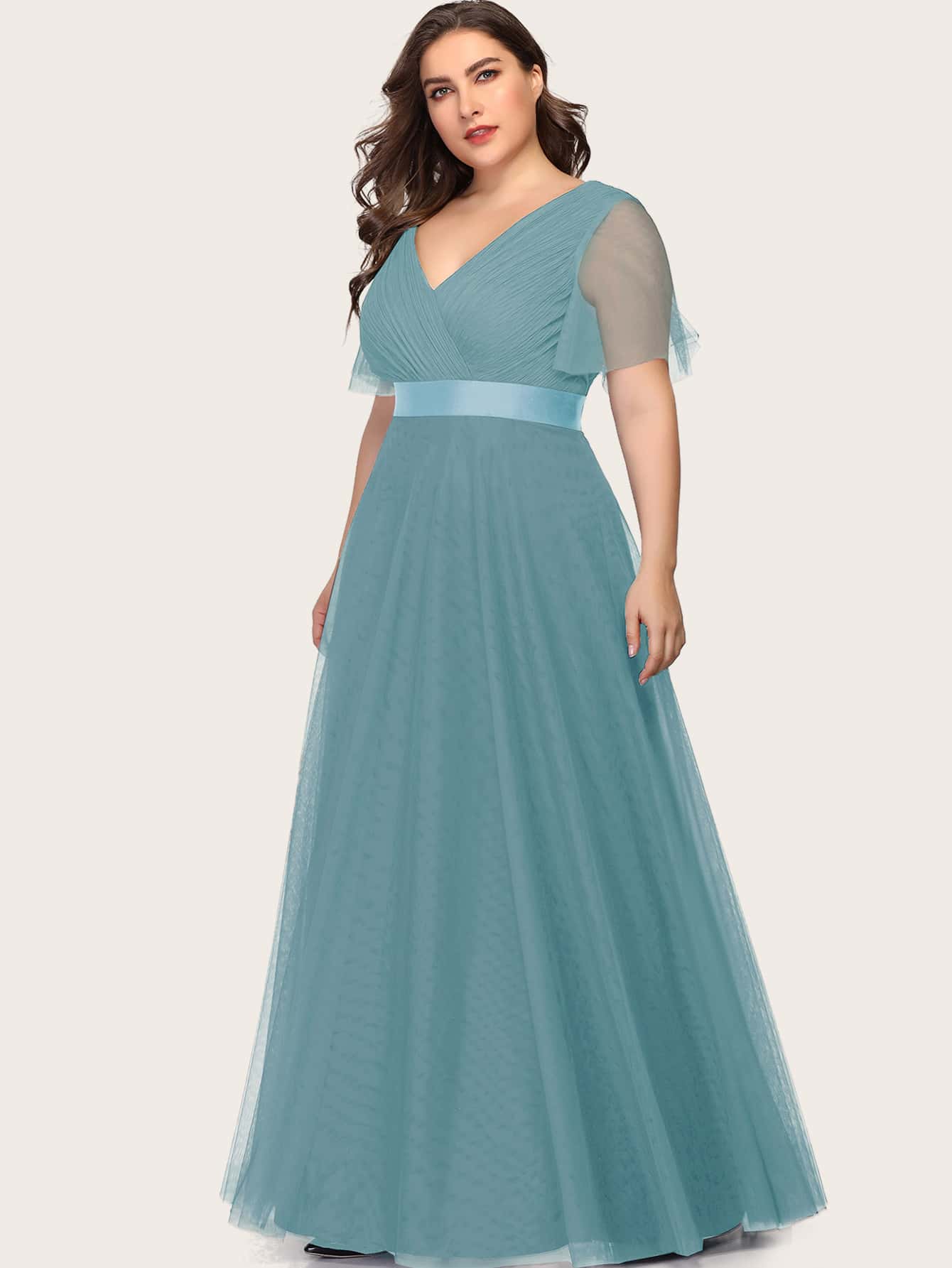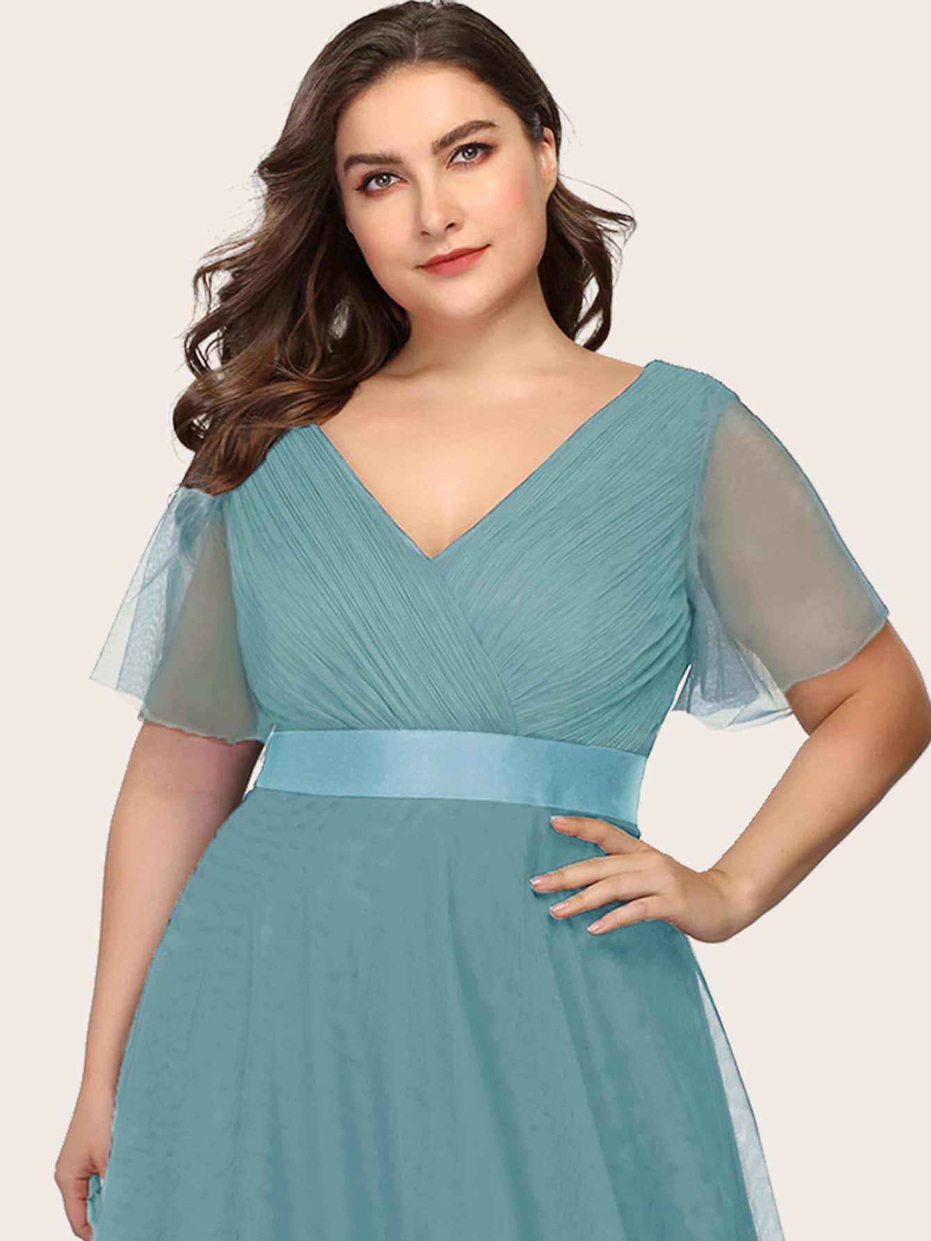 Vestido de dama de honor azul de talle alto con volantes en el busto, adecuado para invitados de boda de otoño de talla grande